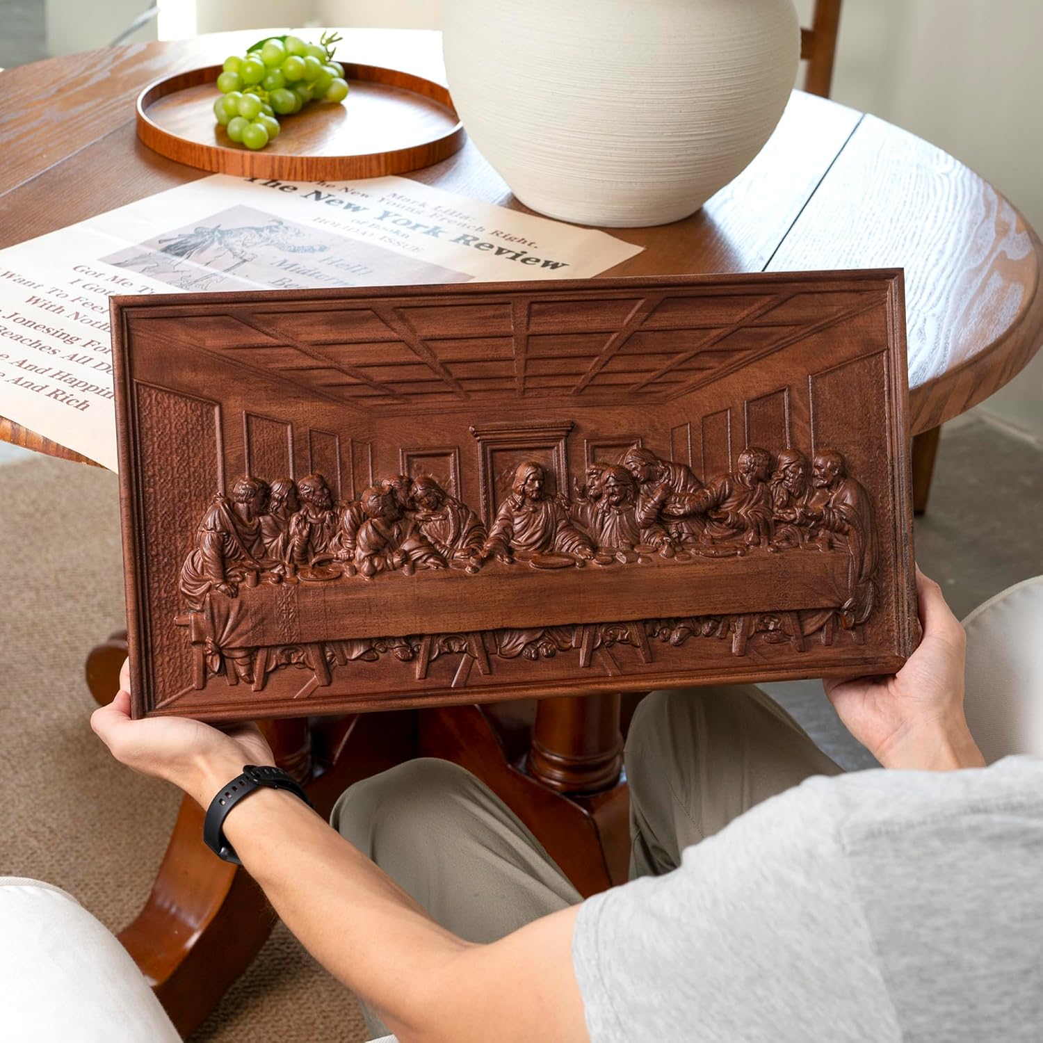 All products in our store are handmade products - Carved from european beech wood by skilled craftsmen.We are committed to creating high-quality products to bring you a comfortable experience.SizeThe Last Supper Plaque measures 19.7"L*10.4"W*1.4" and weighs 5.3LB(3.4KG)The Story "The Last Supper" is a story in the Bible. On Passover night, Jesus and his 12 disciples had a meal together. During the meal, Jesus told everyone that one of the disciples had betrayed him. After hearing this, the 12 disciples were either shocked, angry, excited, or nervous. "The Last Supper" shows the tense scene at this moment. It shows a vivid and true story, thus giving this work creativity and historical significance, reflecting the struggle between justice and evil, and promoting the humanistic spirit of the times.A Good After-Sales ServiceIf you have any questions after purchasing the last supper wall decor, please contact us as soon as possible, and we will serve you wholeheartedly.
