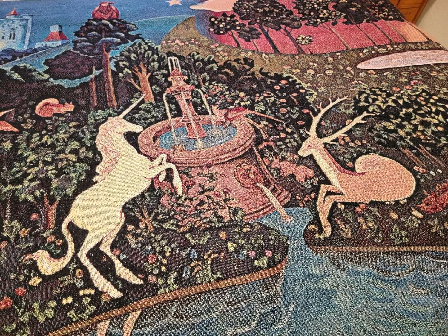 Nearly 35 years ago, the timeless book The Last Unicorn by Peter S. Beagle was turned into an animated movie. With music by America, voices by Jeff Bridges, Mia Farrow, Christopher Lee, Angela Lansbury, Alan Arkin, and Tammy Grimes, and the immense talent of the animators and creatives who would later form Studio Ghibli, The Last Unicorn was an incredible film that gripped the minds and hearts of all who grew up with it. A recreation of the tapestry of the opening credits scene of The Last Unicorn, this tapestry is a fully woven (not printed) textile piece and makes for an excellent wall hanging, a throw for a couch, or even as a blanket to snuggle up in. Measuring 54″ x 90″ (4.5 ft x 7.5 ft, or 1.4m x 2.3 meters) and made of 100% cotton, the scene depicts the Unicorn in her forest in a recreation of the classic style of medieval European tapestries and draws inspirations from the Unicorn tapestries of the early 1500s, now residing in The Cloisters in New York. The Unicorn rears up near a fountain in her forest, nearby to a Hart, a pair of lions, and other woodland creatures, with Eagle watches over the scene, and a castle in the background set amidst a transition to nightfall. This iconic piece is entirely made in the USA and is a fabulous celebration of the beloved classic film, and is easy to hang with nails or tacks, and a rod pocket sewn onto the back for traditional hanging (rod not included). So if you need a medieval style tapestry of The Last Unicorn, for laughs, for luck, or to brave the unknown, don’t miss this beautiful recreation of one of the most