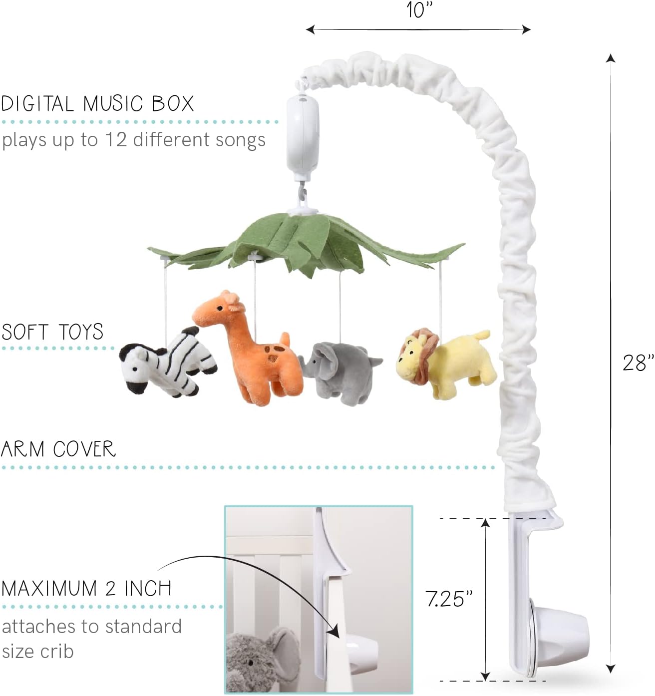 Bring all the jungle vibes right to your baby boy nursery with the 8 piece Safari Adventures baby bedding set by the Peanutshell. Our colorful, multi-functional crib quilt features an elephant, lion, monkey, and more enchanting safari animals hanging out amid leafy scenery in various shades of blue and green. A tonal gray geometric border with printed leaf detail inside perfectly frames this adorable scene. Five fitted crib sheets come in a perfect universal fit, designed for a standard 28” x 52” crib mattress with snug fitting all around elastic. The crib sheets feature solid green and white along with playful elephants and bright, colorful jungle animals and leaf clusters. The musical crib mobile features sweet giraffe, playful zebra, adorable elephant, and a mighty lion in bright tropical shades playfully hang from a central canopy of giant leaves. Canopy leaves are made from felt, and each character is made of super-soft white velour with embroidered details. The tonal gray geometric print bed skirt rounds out the look. This nursery set includes 1 crib quilt, 5 fitted crib sheets, 1 crib mobile, and 1 three sided dust ruffle. Coordinate this set with our other jungle themed nursery decor, crib sheet sets, and layette sets to complete your Safari Adventure baby boy bedroom.