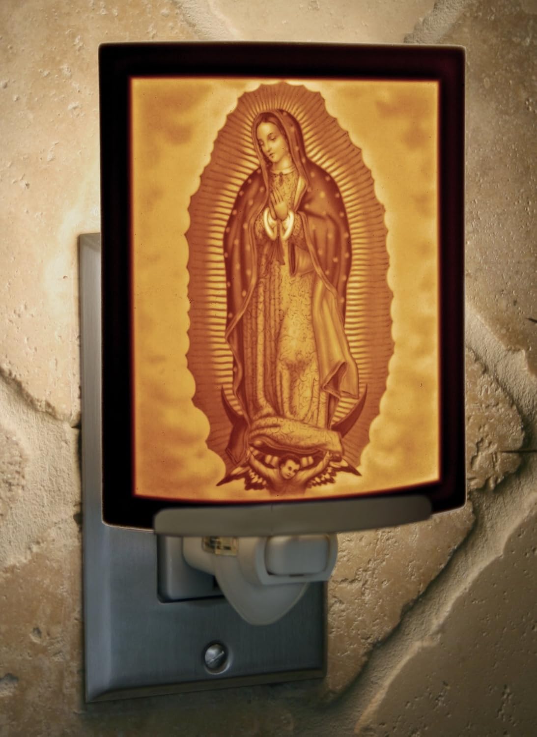 This is a "lithophane"; a thin translucent porcelain night light, made using a lost art from the 1800's. When lit from behind, the light shining through the different thicknesses of the carving causes a highly detailed image to appear in front, almost magically. As you see, the illuminated image is so detailed, that it has a totally photographic quality to it! In addition, the relief of the carving gives the image a 3 dimensional quality when seen in person. To make them, we start by carving the image in a translucent wax, with the wax lit from behind. We then take a plaster mold of this engraving, and we then cast a fine porcelain clay into this mold. We then kiln fire the porcelain to 2300 degrees F. to achieve it's translucency and durability. Lithophanes were invented in France in 1827, and were popular throughout Europe till the early 1900's. They mysteriously faded from popularity with the advent of electricity, which is ironic as they look way better with electric light than candles. We first started making them 32 years ago by reproducing the antique ones. We eventually learned how to engrave our own originals, and this has been our specialty ever since. Our lithophanes truly make for a beautiful and practical piece of art that you will use daily for year after year! This image, also known as the Virgin of Guadalupe, is a Catholic title of the Blessed Virgin Mary associated with the venerated image enshrined within the Minor Basilica of Our Lady of Guadalupe in Mexico City.