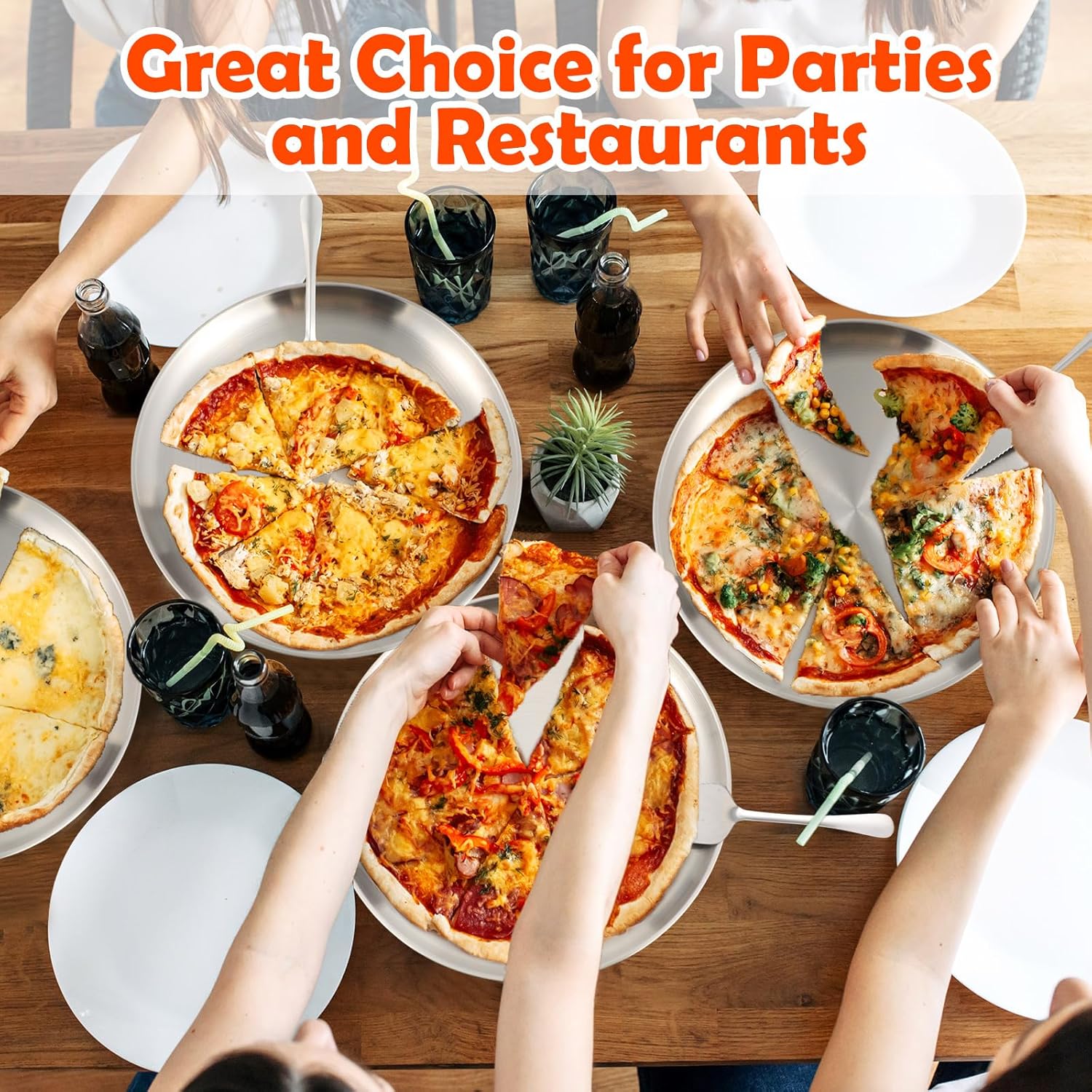 Features: Large Capacity: The stainless steel round pizza baking pan is suitable for holding and displaying many items, such as food, tableware, cups, etc., which helps to organize your items and keep your space tidy. Multi-purpose pizza spatula: The smooth handle curve and triangular head design make the spatula comfortable to hold and control, bringing a pleasant experience. Specifications: Material: stainless SteelColor: silverSize: Pizza baking pan: 12 inches in diameter, 0.75 inches in height Pie server: 9.05 inches in length, 1.77 inch in widthPackage includes: 8 x Pizza serving tray8 x Pizza serverWarm notes: Manual measurement, please allow slight errors in size. The color may slightly differ due to different screen displays.