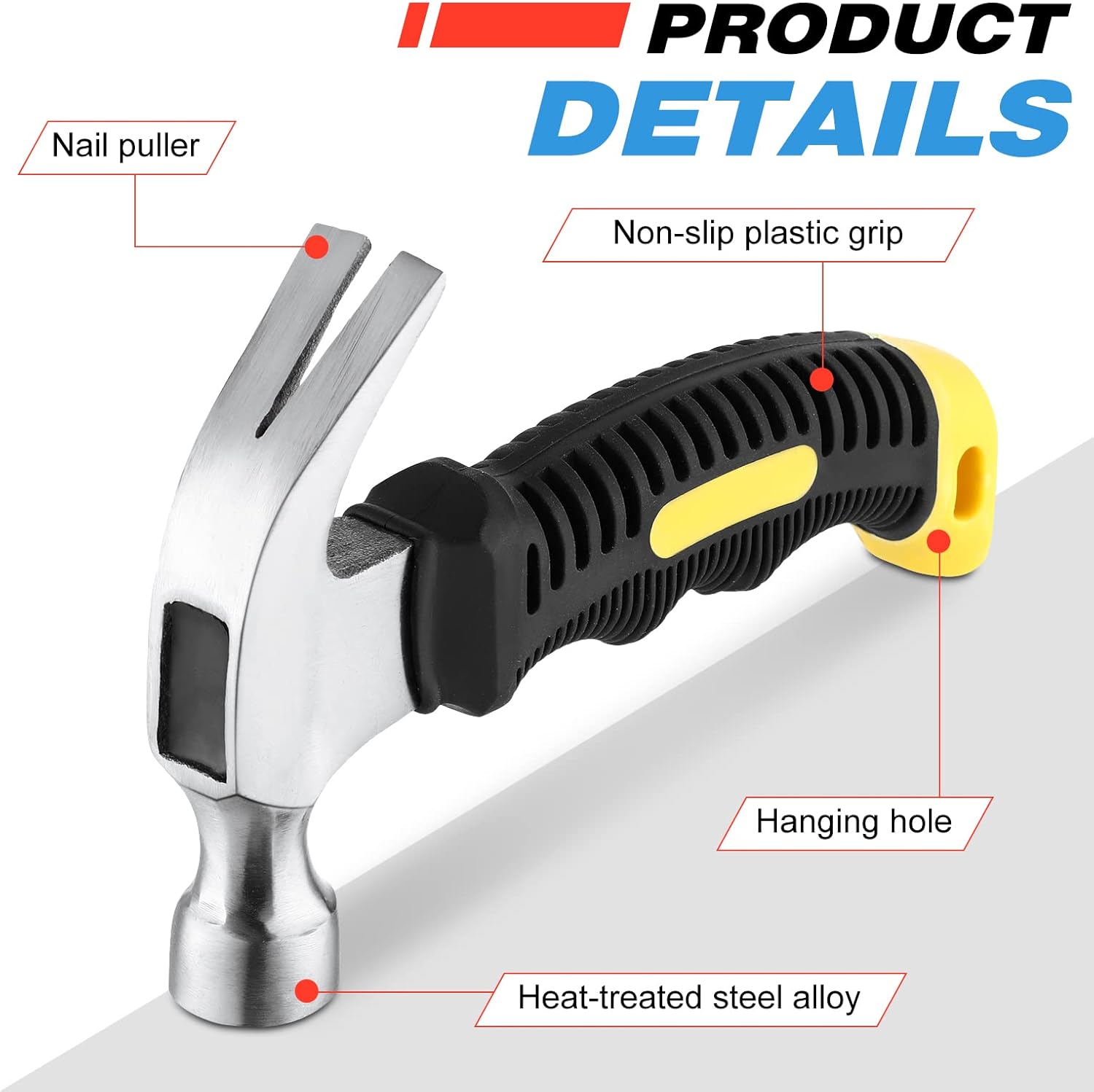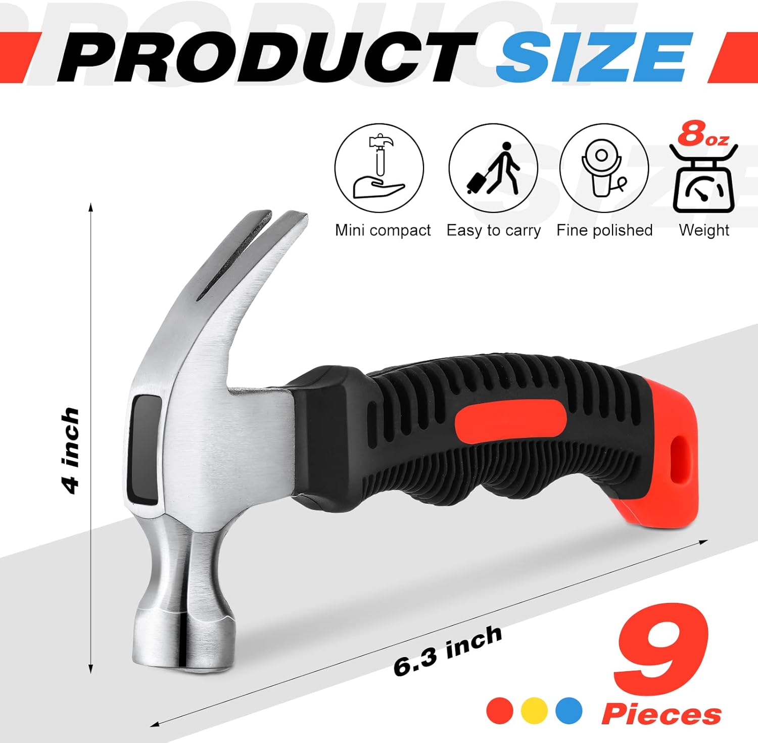 Feature: Double head design: The little claw hammer set head is finely polished and has no burrs. The framing hammer is heavy, and the round head is accurately placed on a side for precise strikes, while the curved claw head on the other side can easily enter the narrow area for nailing. Easy to control: The claw hammer is less bulky than a regular hammer, making it easier to control for accuracy. Perfect for fine delicate work such as driving pin nails, tacks, or staples, for curtain and picture hanging, works as a regular size with more mobility in tight places. Specifications: Material: carbon steel, rubber handle Dimensions: approx. 4 x 6.3 inches/ 10 x 16 cm Color: orange, yellow, blue Weight: 8 oz Package includes: 9 x Small claw hammer Warm notes: Due to the weight of the claw hammer, please do not play with children under 7 years old. Hammer shall not be stored in a wet place to avoid oxidation. When not in use, please tie the polishing head with a plastic bag to avoid prolonged exposure to the air. Please allow slight deviation due to manual measurement. Please allow slight color differences due to different monitors.