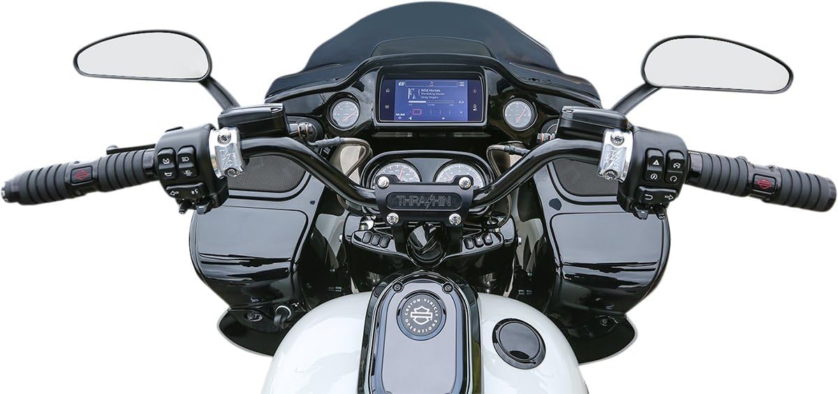 Designed to put Thrashin Risers on Road Glide motorcycles. Raises riser mounting location 23/8in. and moves mounting location 15/8in. towards the rider. Two grade-8 bolts dropping through the triple clamp ensure maximum control and peace of mind. Includes mounting hardware, chromoly steel bushings, cut template and instructions.