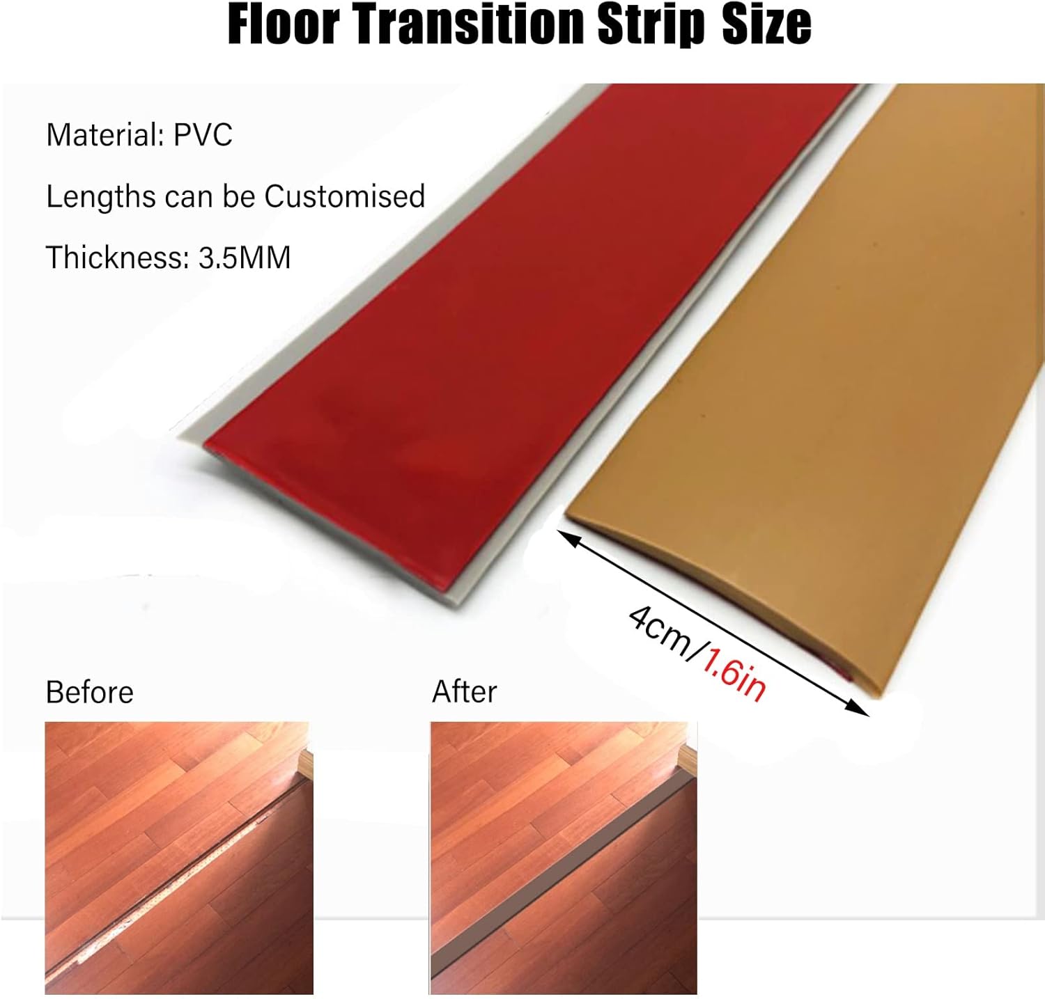 Carpet floor transition strip offer the perfect materials and quality for you and your family.This Floor Transition Strip connects Door gap. Provides smooth transition between adjoining flats. Product Specifications - Material: PVC - Width: 4cm/1.57in - Whether to customize: Yes - Whether to cut: Yes Features - Carpet Floor Edging Trim/Transition Strip for Doorways/Countertop Edge Trim - Self-Adhesive/Peel and Stick - Environmentally friendly PVC material, flame retardant, anti-aging Package - Floor Transition Strip × 1 Note: - Please allow a slight deviation due to manual measurement. - Due to the different display and different light,the picture may not reflect the actual color of the item.