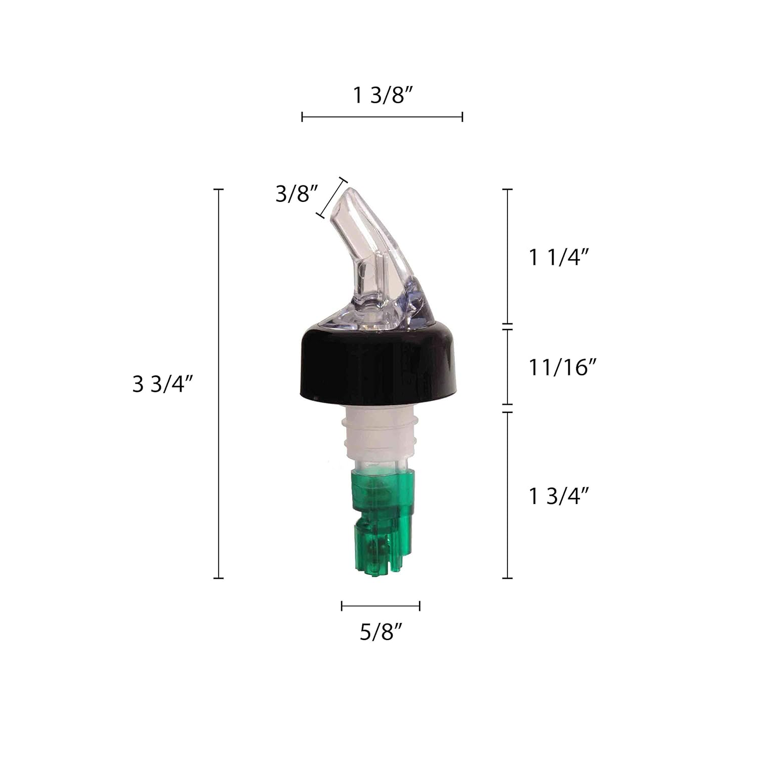 Liquor Pourer, 3/4 oz., with black collar, fits standard 750ml bottle, SAN (plastic), clear spout, green tail (12 each per pack)