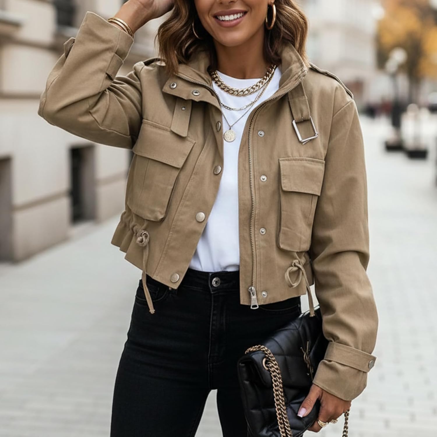Designed for the modern woman, this lightweight bomber jacket is perfect for layering during those crisp autumn days in 2025. Crafted with a chic cropped silhouette, it flatters your figure while providing the comfort and functionality you need.This bomber jacket features a convenient zip-up front and button closure, allowing for easy wear. The drawstring detail adds an extra touch of style, making it adjustable to suit your preference. With spacious pockets, it's perfect for storing essentials on the go, whether you're heading out for a casual day or a night out.This cropped jacket combines elements of a military jacket with the trendy vibes of a cropped trench coat.Whether you're looking for a comfortable and fashionable option for everyday wear or a statement piece for a occasion, this short jacket fits the bill perfectly.