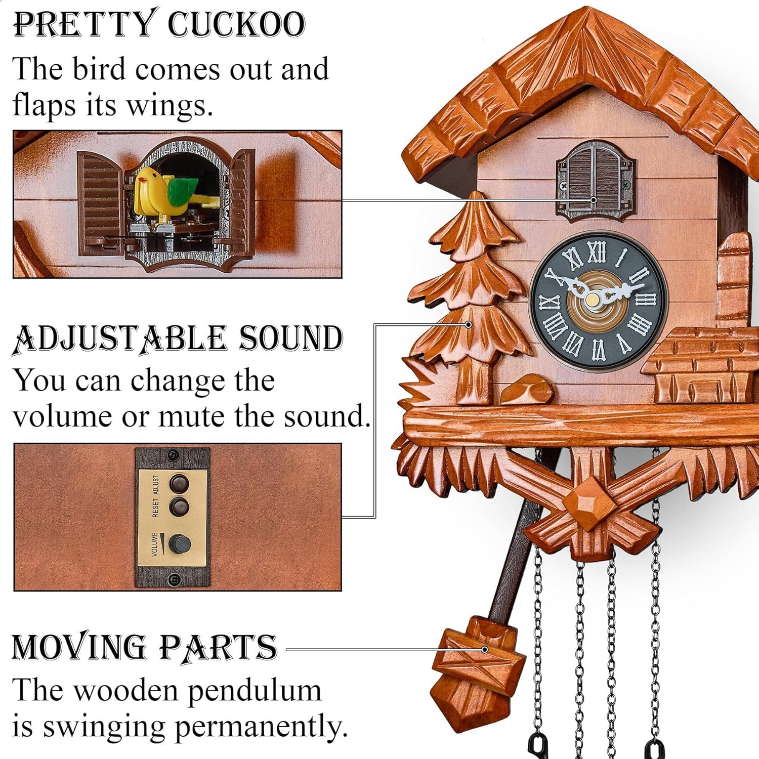 | Additional Features | Adjustable Volume, Automatic night silent mode, Hourly Chime, Made of wood, Quartz movement |