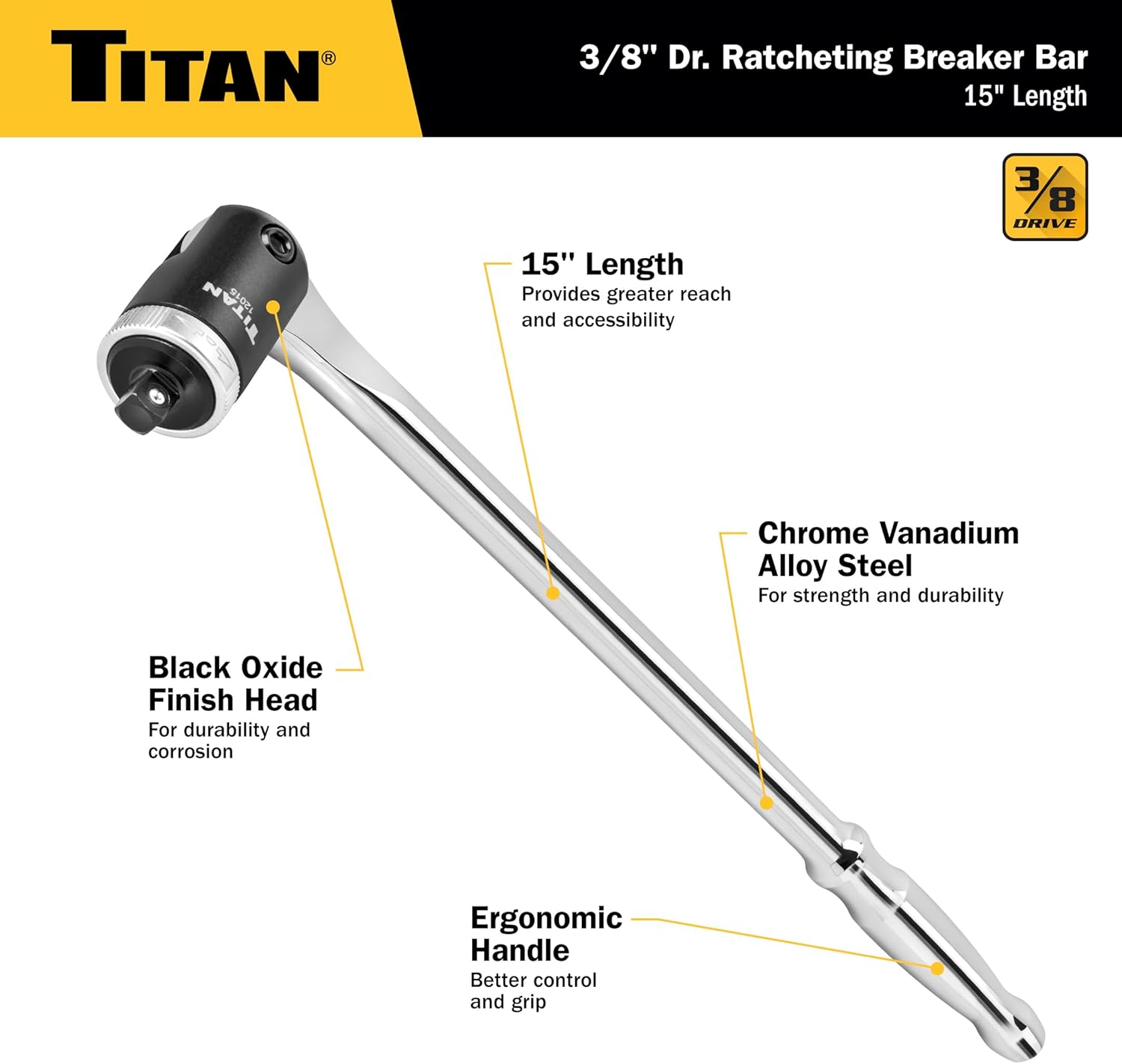 Titan 3/8 inch Drive 15 inch Ratcheting Breaker Bar features a 15 inch ratcheting breaker bar. It has a 3/8 drive with a 3/8 drive ratchet head that swivels 180 degrees. It has heavy duty chrome vanadium steel construction. It has a maximum torque: 148 feet/pounds. It has (20 kilograms/m) and a three way ratcheting action: right-hand thread, left-hand thread or lock. It has a chrome plated bar and a black oxide finish on the head to resist corrosion.