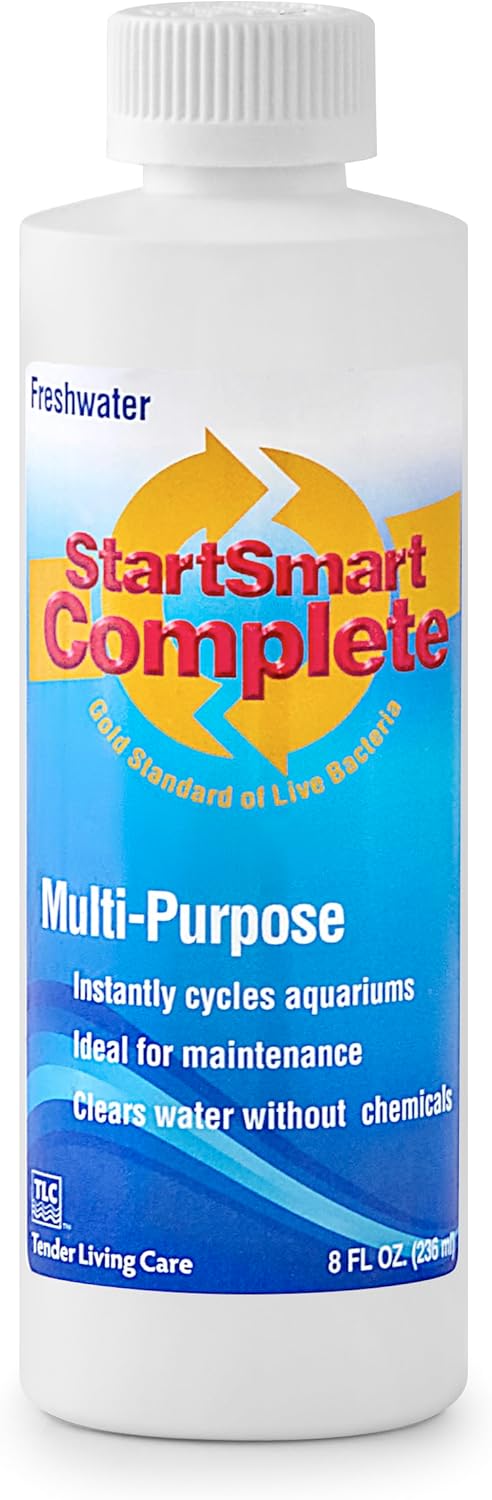 StartSmart Complete Freshwater is a beneficial aquarium cycle starter that makes fishkeeping easier. This concentrated formula rapidly establishes nitrification and cycling to help prevent ammonia and nitrite spikes in new or established fish tanks, while supporting clear water without harsh additives. It aids in the natural breakdown of organic waste for less sludge and odors, enhancing biofiltration and helping stabilize water quality for community and planted aquariums. Dosing: 1 oz per 10 gallons for new-tank cycling, 1 oz per 20 gallons for water-clarity support, and 1 oz per 40 gallons for routine maintenance. For new tanks, add after dechlorination; cycling typically completes within 24–72 hours. For clarity challenges, dose weekly until desired results are achieved. Available in multiple sizes. Not for human consumption. Store at room temperature and follow label directions.