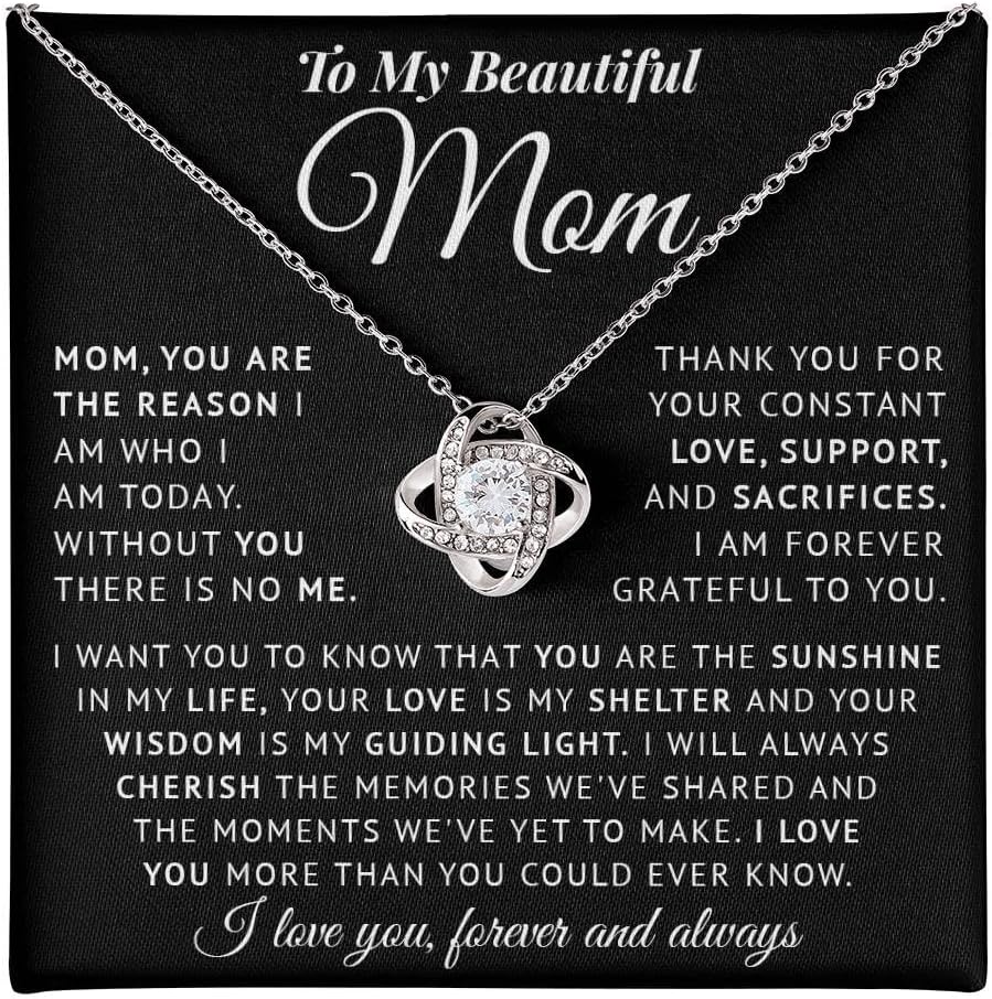 Love Knot Necklace. Representing an unbreakable bond between two souls, this piece features a beautiful pendant embellished with premium cubic zirconia crystals. Surprise your loved one with this gorgeous gift today! 14k white gold over stainless steel 6mm round cut cubic zirconia stone Pendant dimensions: 0.6" (15.7mm) height / 0.23" (6mm) width Adjustable chain length: 18" - 22" (45.72cm - 55.88cm) Lobster clasp attachment Comes with the bracelet is a standard box\LED luxury box and a meaningful message card
