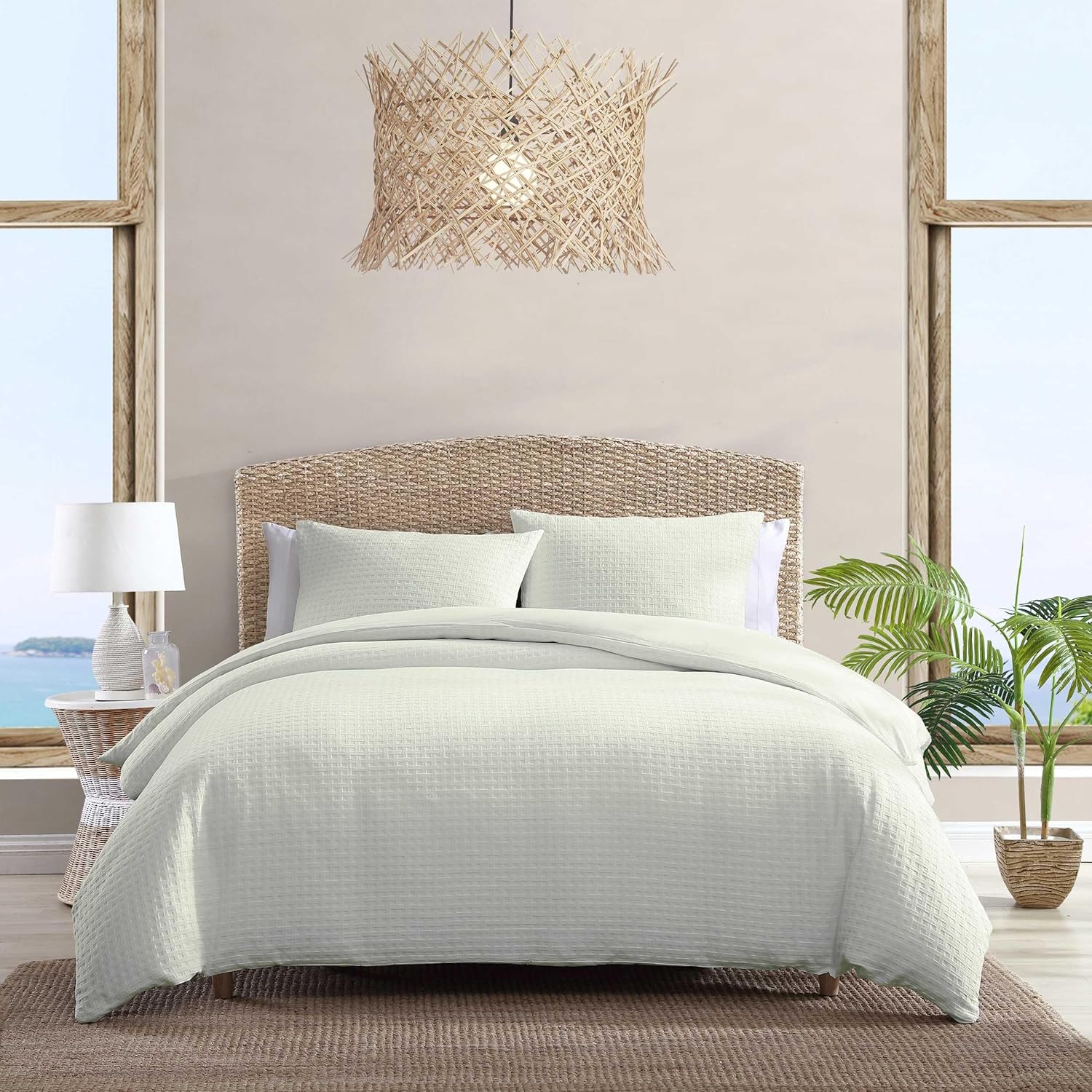 Transform your bedroom into a serene oasis with the Tommy Bahama Basketweave Duvet Cover Set. This all-cotton comforter set features a unique and subtle basketweave woven design on a solid white ground. The reverse is a matching solid white ground on cotton. Pair with a new Tommy Bahama sheet set or additional decorative pillows (sold separately) for a more complete tropical look in your home. Duvet cover features a button closure and additional inner corner ties to secure duvet insert in place during use. The duvet insert is not included and ensemble is machine washable for easy care.