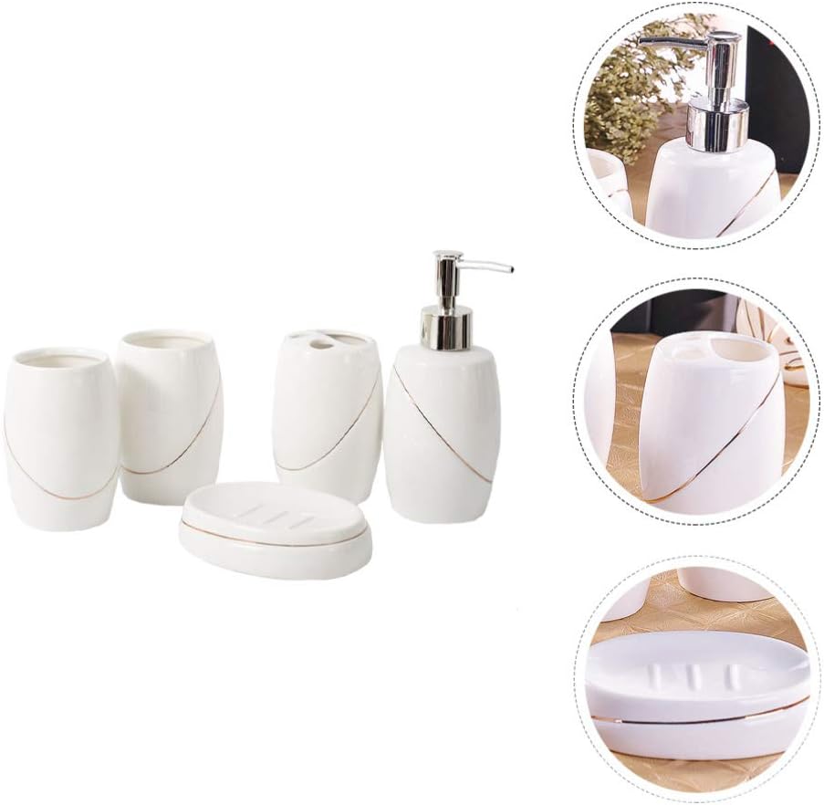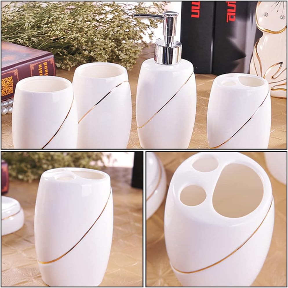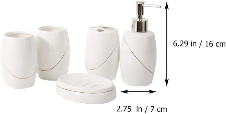 Description Well Designed Bathroom Set: Classy look, all of the items compliment each other. Our bathroom decor set matches your bathroom in a Features- Color: White- Packaging size: 34x24x11cm/ 13. 4x9. 4x4. 3in- Material: Ceramic Package Including 1 x sub bottle 1 x soap plate 1 x toothbrush rack 2 x gargle cups
