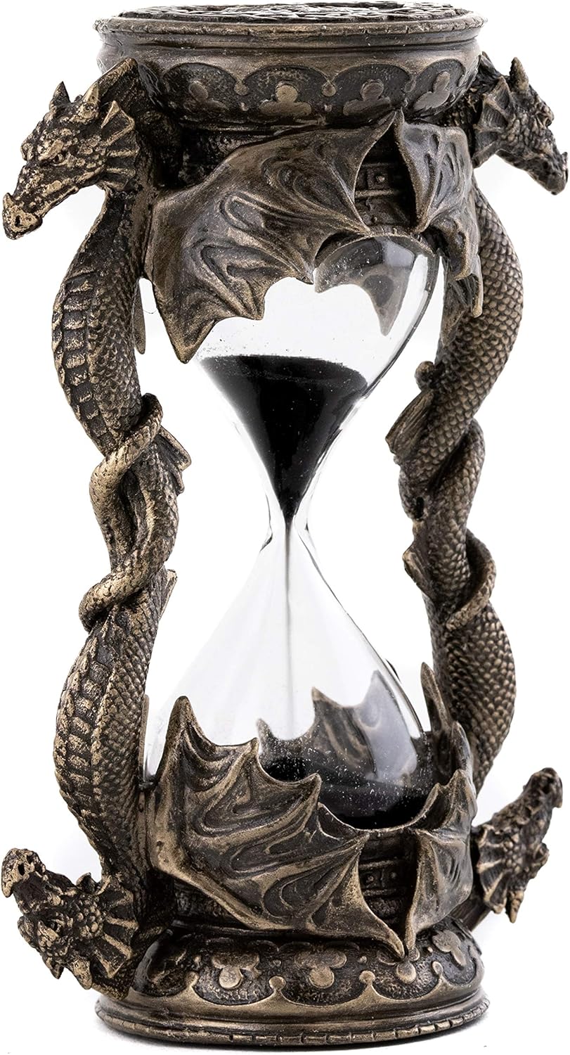 ✔️ EXQUISITE CRAFTSMANSHIP - Premium sculpted cold cast bronze - real bronze powder mixed with resin. Hand-painted in bronze finish to give a high-quality antique look without sacrificing the details. ✔️ MEASURES - 5.75 inches tall, 4 inches wide, and 2.25 inches long. Beautiful transparent glass sand timer to display in your office or bookshelf. Perfect to use this sand clock for any timed board games or fantasy role play. ✔️ UNIQUE PRESENT - Packed in beautiful gift-box ready for any occasion. Ideal for Gothic friends or relatives that love mythical creatures. ✔️ Sand timer empties in five minutes.