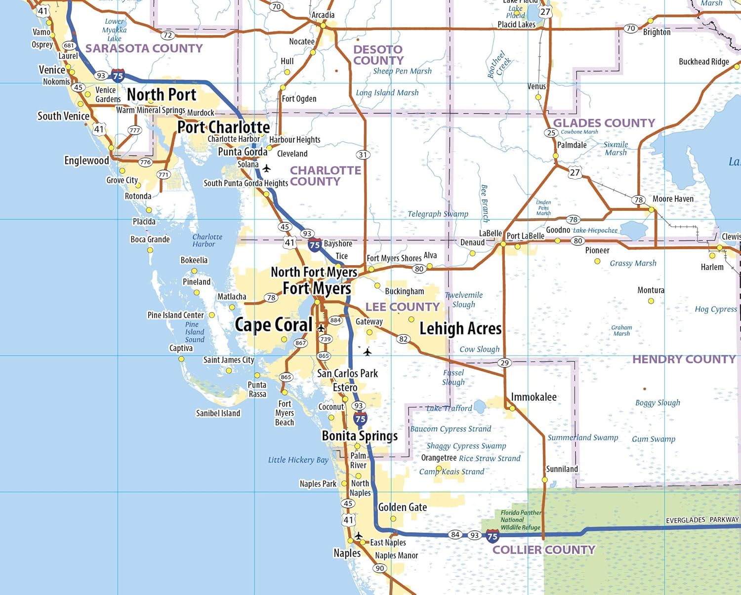 Our laminated map of Florida shows counties, towns, cities, and major highways. This map is a great tool for visualizing the entire state. More detailed insets are included for Orlando, Tampa Bay, and the Miami - West Palm Beach corridor. This map comes in a variety of sizes, and is shipped rolled in a sturdy tube. Read more