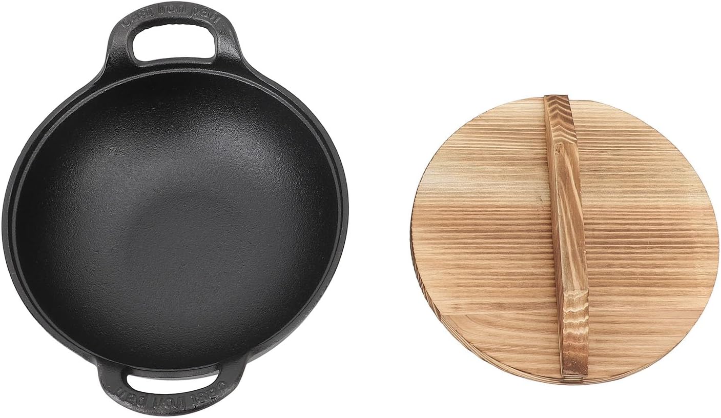 Features:Authentic Asian Cooking Tool: Designed to provide a traditional cooking experience with superior heat retention and distribution, making it ideal for authentic Asian dishes.Even Heat Distribution: Cast iron's excellent heat retention properties help maintain consistent temperatures and prevent hot spots for evenly cooked food.Uncoated Surface: The wok's uncoated surface allows for healthier cooking by avoiding synthetic coatings and chemicals, preserving the flavors of your ingredients.Wooden Lid Included: Comes with a wooden lid that fits ly to prevent spatter and allow for versatile cooking methods such as simmering, steaming, and frying.Flat Base Design: Features a flat base for stable placement on your stove, reducing the chances of spills and providing a sturdy cooking surface.Versatile Cooking Capabilities: Suitable for various cooking methods including stir-frying, deep-frying, grilling, and steaming, making it a versatile addition to your kitchen.Affordable Price: Offers a cost-effective alternative to stainless steel and enameled cast iron woks without compromising on quality or durability.Easy Maintenance: With proper care, this cast iron wok can develop a non-stick surface over time, simplifying cleaning and maintenance.Family-Friendly Cooking: The wok's design allows for the preparation of larger quantities of food, making it for family meals and gatherings.Item Type: Cast Iron WokMaterial: Cast Iron, Solid WoodPackage List:1 x Cast Iron Wok 1 x Lid