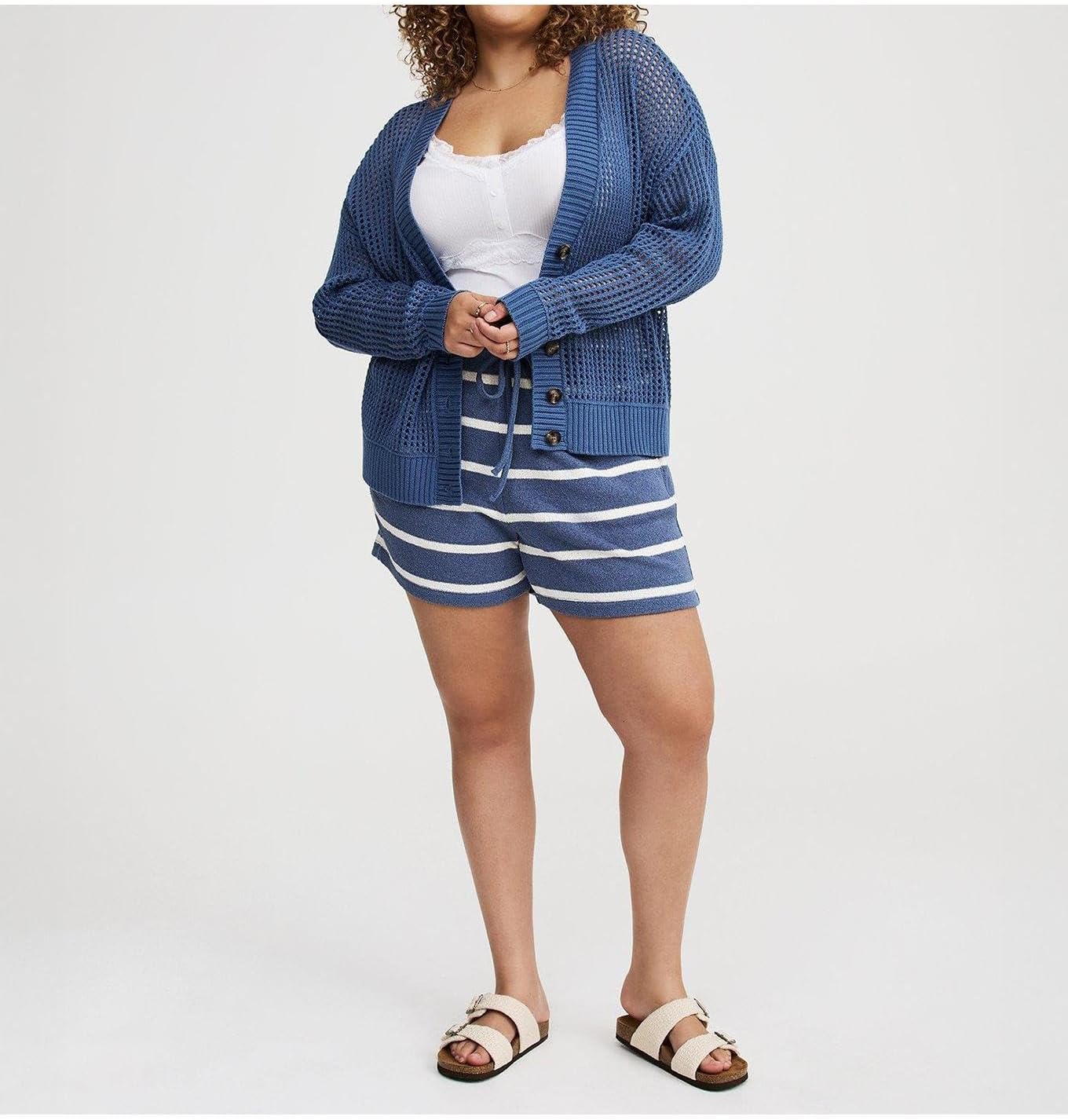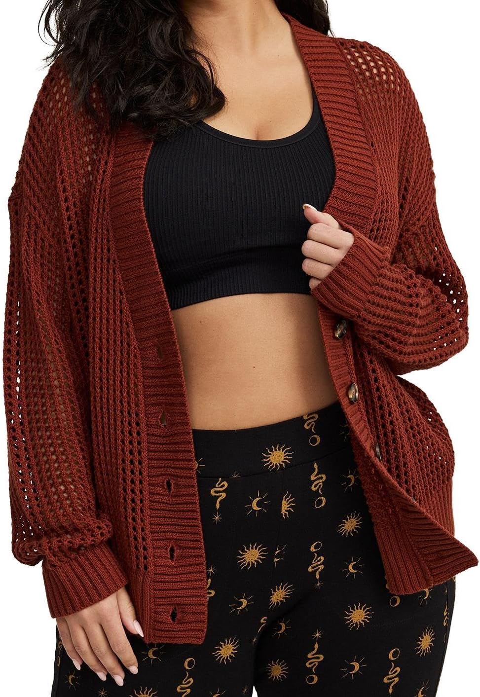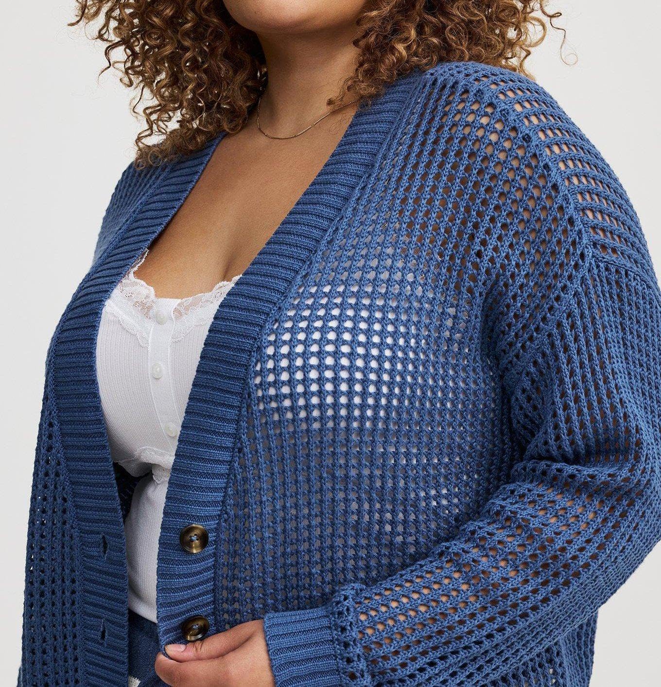FITModel is 5'8" wearing size 1.Cardigan silhouette.Measures 28" from shoulder (size 2).MATERIALS + CAREPointelle knit fabric.60% cotton, 40% acrylic.Machine wash cold. Tumble dry low.Imported.DETAILSButton-up.Long sleeves.Open stitch detail.