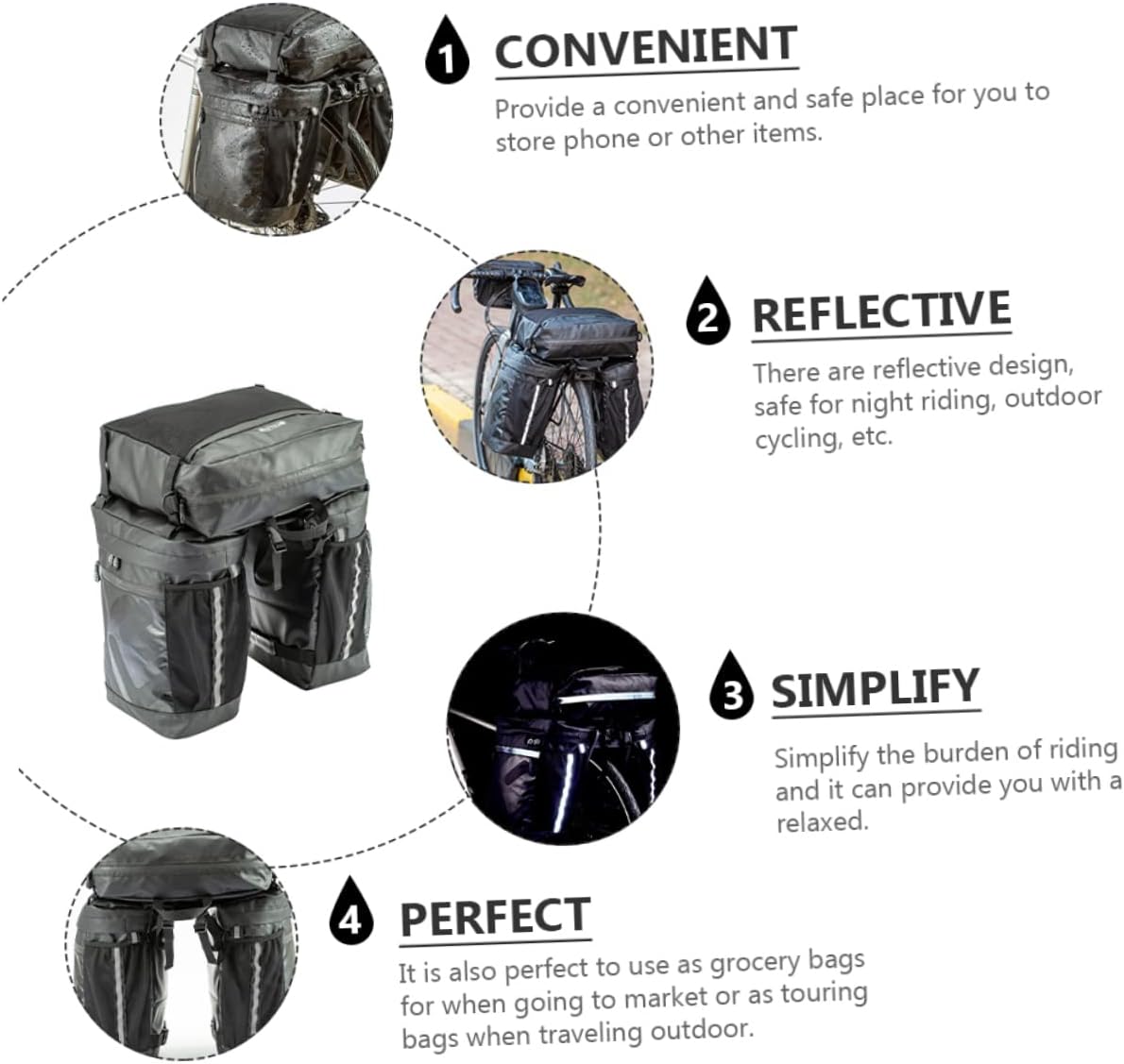 Package List 1 x Bicycles Rear Shelf Bag Characteristics - Size: About 33.00X33.00X14.00cm/ 12.97X12.97X5.50inch Cycling Bag. - Color: Black Bike Travel Bag. - Material: EVA Rear Bicycles Bag. - Capacity: 50L Bike Saddle Bag. - There are reflective design, for night riding, outdoor cycling, etc Bike 3-in- Carry Bag. - The bike storage bag is made of and material, and convenient to use Bike Pannier Bag. - Simplify the burden of riding and it can provide you with a relaxed and enjoyable cycling experience Mountain Bike Carry Bag. - Provide a convenient and place for you to store phone or other items, suitable for most bikes Bicycles Rear Carry Bags. - It is also to use as grocery bags for when going or as touring bags when traveling outdoor Bike Rear Shelf Bag.Goods InformationBike Carry Bag Our saddle bag is designed to make packing and cycling earlier.Rear Bicycles Bag We know your love seeking .Carry Bag Your next trip will be fuss- with bags made to fit to your bike and your needs.Cycling Bag Whether you are headed into the wide or just navigating around the city