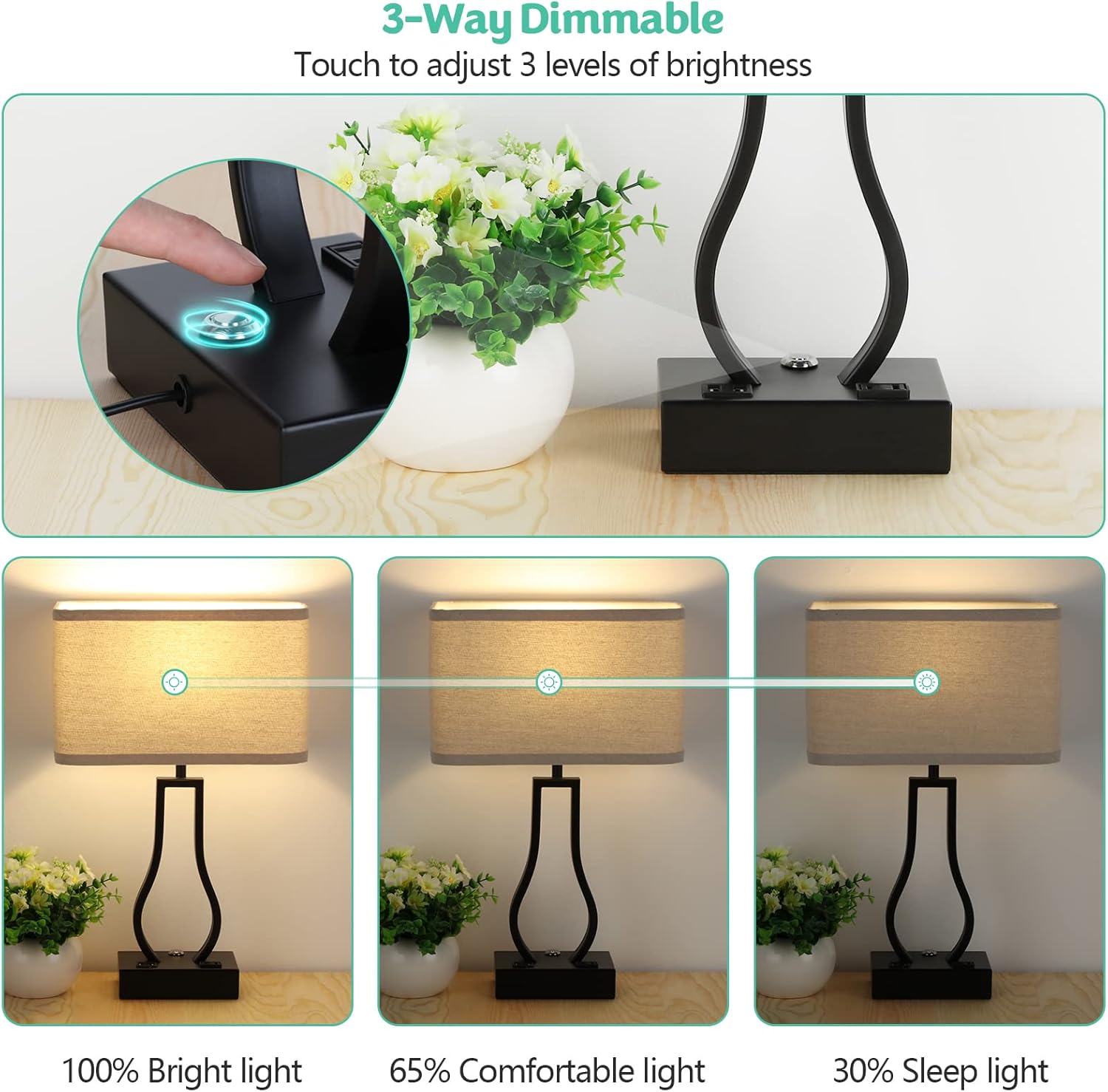 | Additional Features | 3-Way Dimmable, Dual 5V/2.1A USB ports and one 2-prong AC outlet |