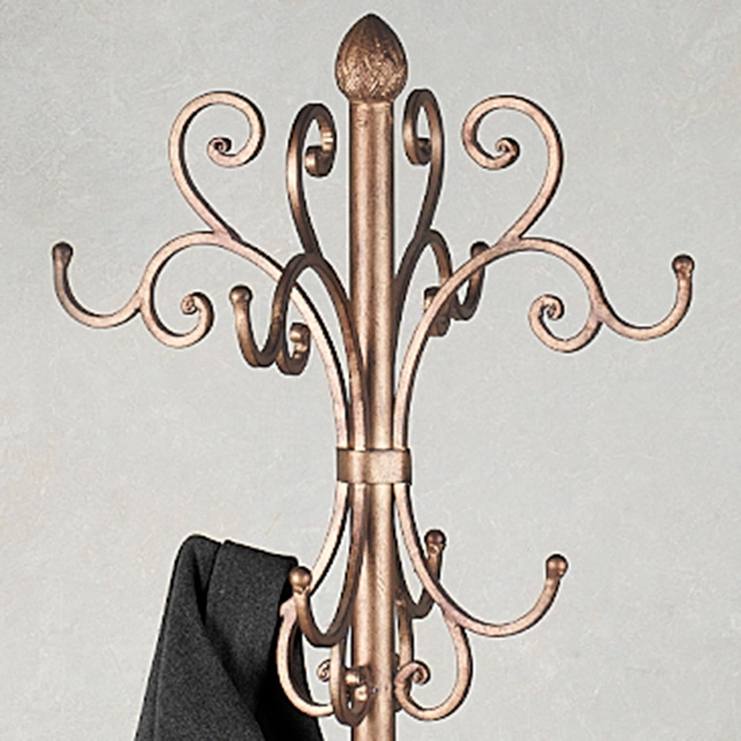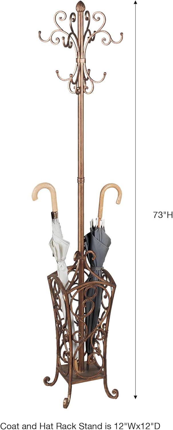 The traditional Kensington Coat and Hat Rack Stand will bring convenient storage to your entryway. Metal rack has an airy scrollwork design on its hooks, feet, and basket. Eight hooks at the top allow you to hang your coats, jackets, scarves, and other clothing; while the openwork bottom basket has four sections for umbrellas and canes. 12 Wx12 Dx73 H, 14 lbs. Metal coat rack stand is finished in antique gold Has an umbrella basket at the bottom Keeps your entryway tidy & organized.