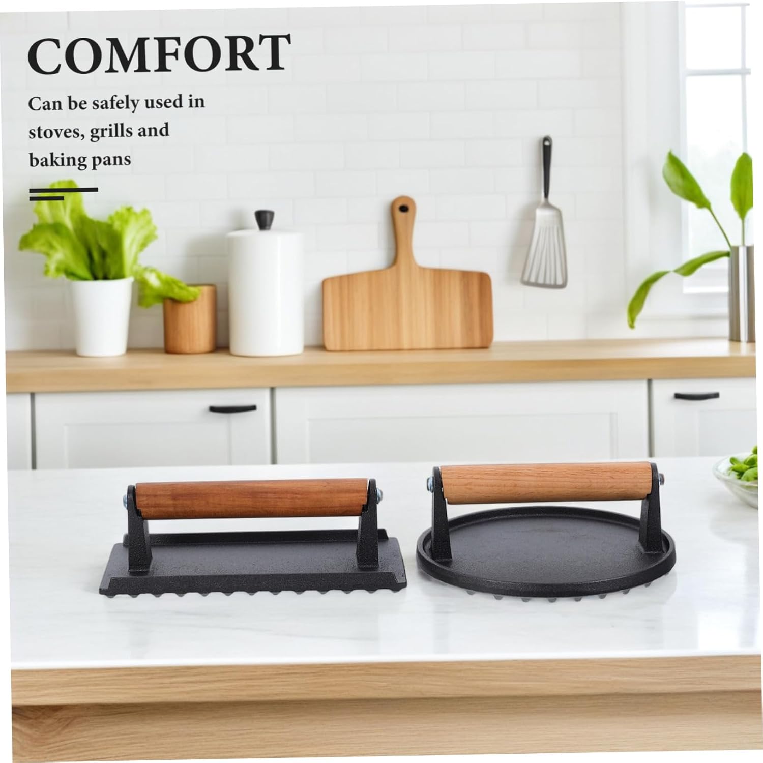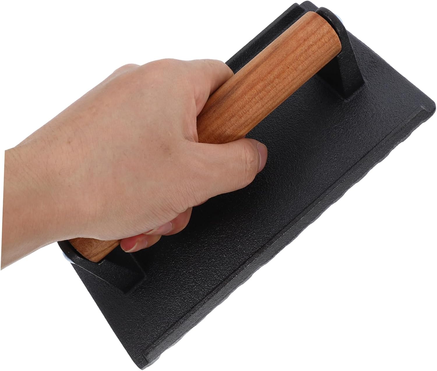 DescriptionThese cast iron meat are designed to make your cooking experience and enjoyable. The meat press is suitable for smaller cuts of meat, while the rectangular press is great for larger items like steaks and sandwiches. The wooden handles provide a secure grip, allowing you to apply the right amount of pressure for optimal cooking.Features-Color:Black-Material:Cast iron, wood-Size:20.00X10.00X6.00cm/7.86X3.93X2.36in-Size:17.50X17.50X6.00cm/6.88X6.88X2.36in-Construction: crafted from durable cast iron, this meat press is built to last, providing reliable performance for all your cooking needs-Heat distribution: the grooved bottom design ensures even heat distribution and allows for efficient grease drainage, resulting in healthier meals-Ergonomics: the wooden handle is designed for a comfortable and secure grip, reducing the risk of burns and slips during use-Versatility: suitable for use on stoves, ovens, grills, and griddles, this press offers great flexibility in your cooking methods-Applications: suitable for pressing bacon, sandwiches, burgers, chicken, steaks, and meat patties, making it an essential tool for any kitchen