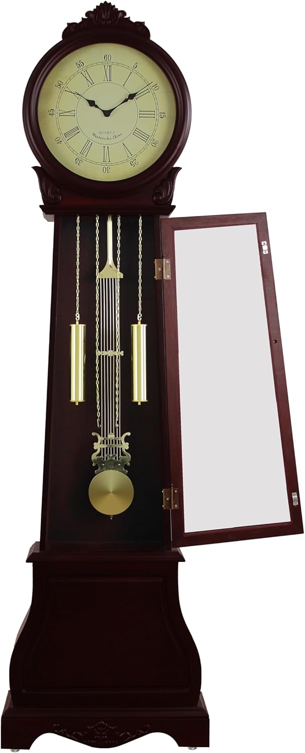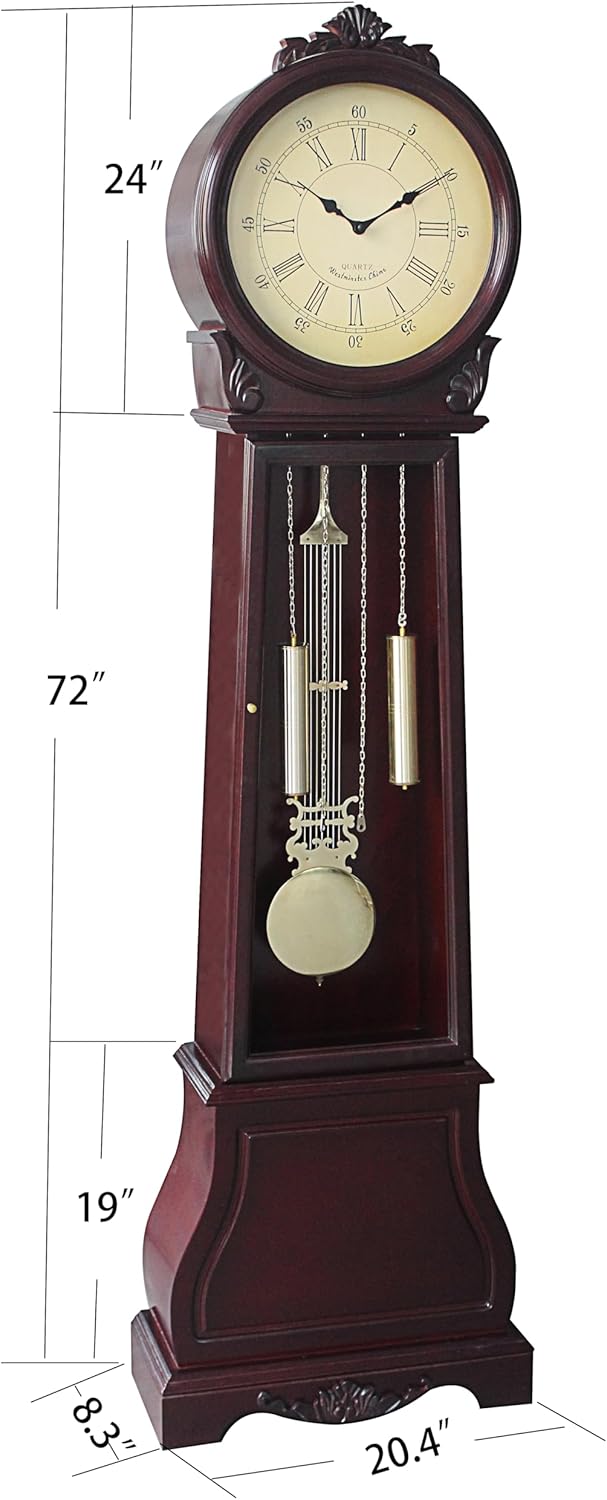 Add timeless elegance to your home with this majestic 72-inch floor-standing grandfather clock. Featuring a rich cherry finish, this stately timepiece combines classic design with modern convenience. The clock face showcases room numerals on a dial for easy time reading. The precision Westminster chime movement marks each hour with melodious chimes and includes an automatic night shut-off feature for undisturbed rest. Crafted from selected hardwoods, engineered wood, and veneers, this grandfather clock offers both beauty and durability. Standing at an impressive 72 inches tall with dimensions of 20 3/8 inches in length and 8 2/8 inches in width, it makes a striking statement piece. The clock operates on 3 AA batteries and 2 C batteries (not included) and comes with sturdy construction that's easy to assemble. This traditional grandfather clock serves as both a functional timepiece and an heirloom-quality piece of furniture that will enhance any room's decor.