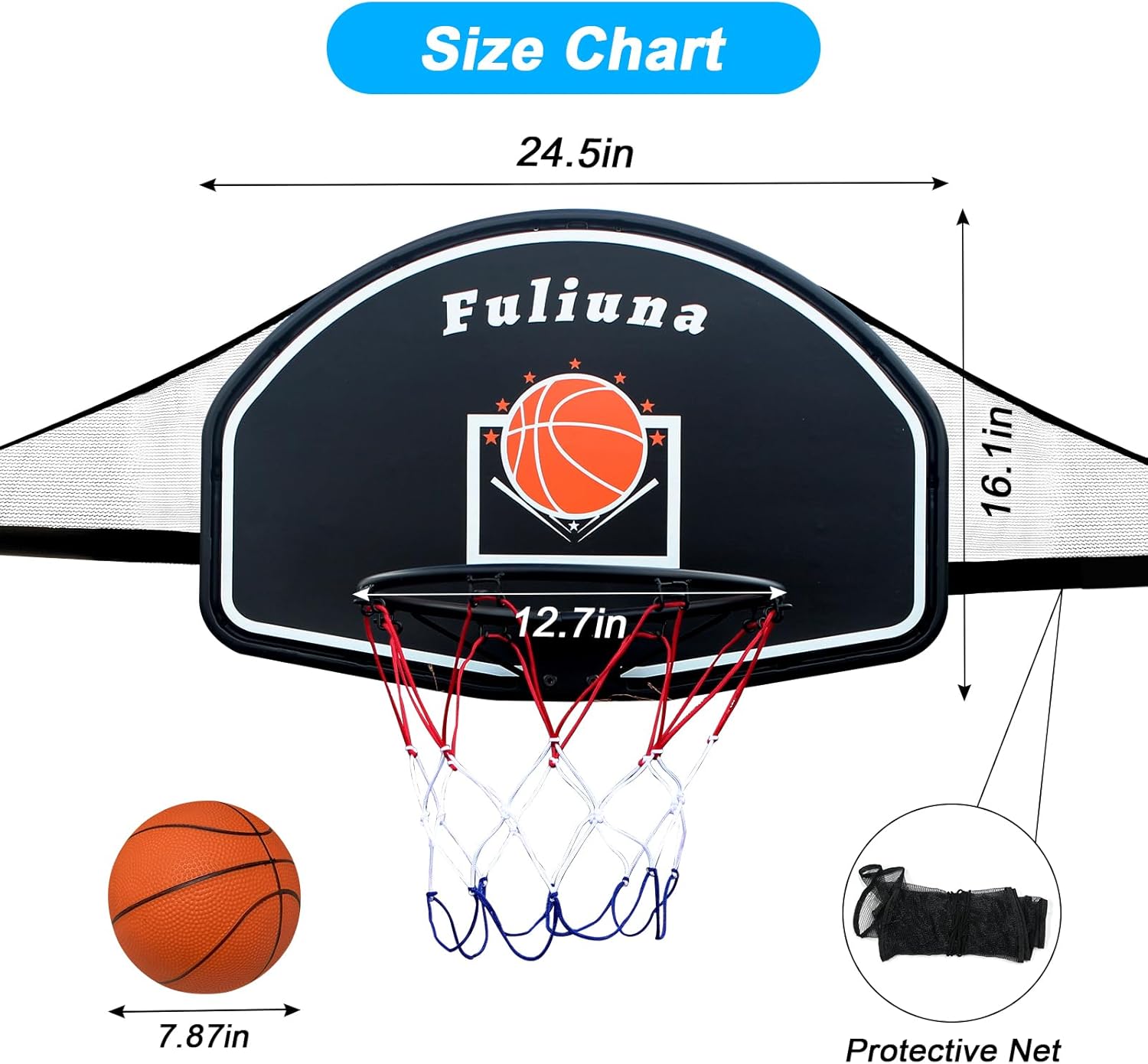 | Included Components | 1 x Mini Basketball, 1 x Protective Net, 1 x Pump, 1 x Trampoline Basketball Hoop |
