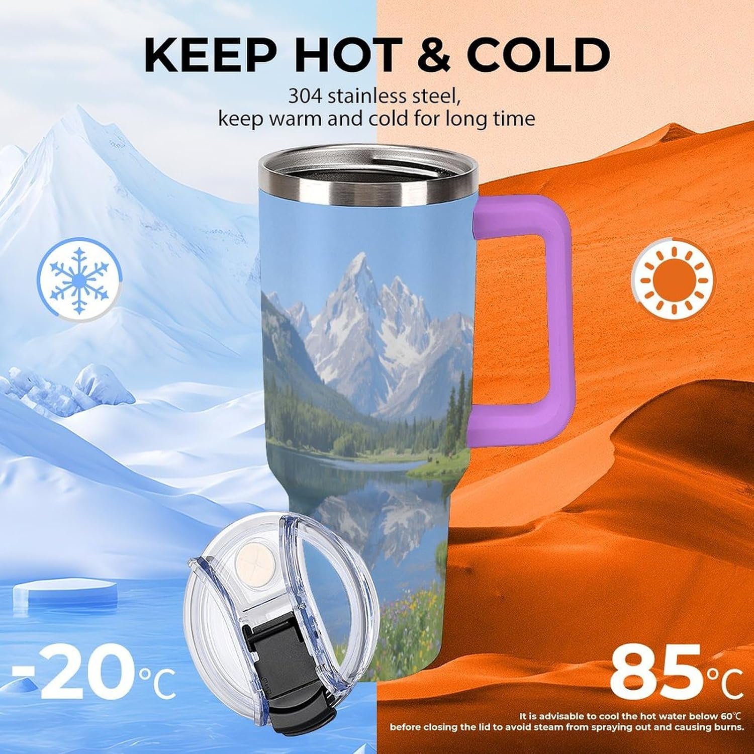 Whether you're on a long drive, a busy commute, or an outdoor adventure, staying hydrated is crucial. Our large-capacity car tumblers featuring the Snow-capped Mountains And Lakes pattern were developed with this need in mind. They're the perfect solution for on-the-go hydration, ensuring a smooth and comfortable journey. With an impressive 40-ounce capacity, this insulated stainless steel travel tumbler easily meets your frequent hydration needs, from your morning commute to your after-get off work workout or even a full-day road trip. Without constantly searching for water, you can focus on the road ahead and say goodbye to thirst. Whether you're sweating it out on a scorching summer day or sweltering in your car on a dry winter night, staying hydrated helps you perform at your best. We understand your appreciation for quality and aesthetics, and our car tumblers feature unique designs that complement any vehicle's interior, exuding understated elegance. More than just a practical tool, they're the perfect finishing touch, adding a touch of style to your vehicle's interior.