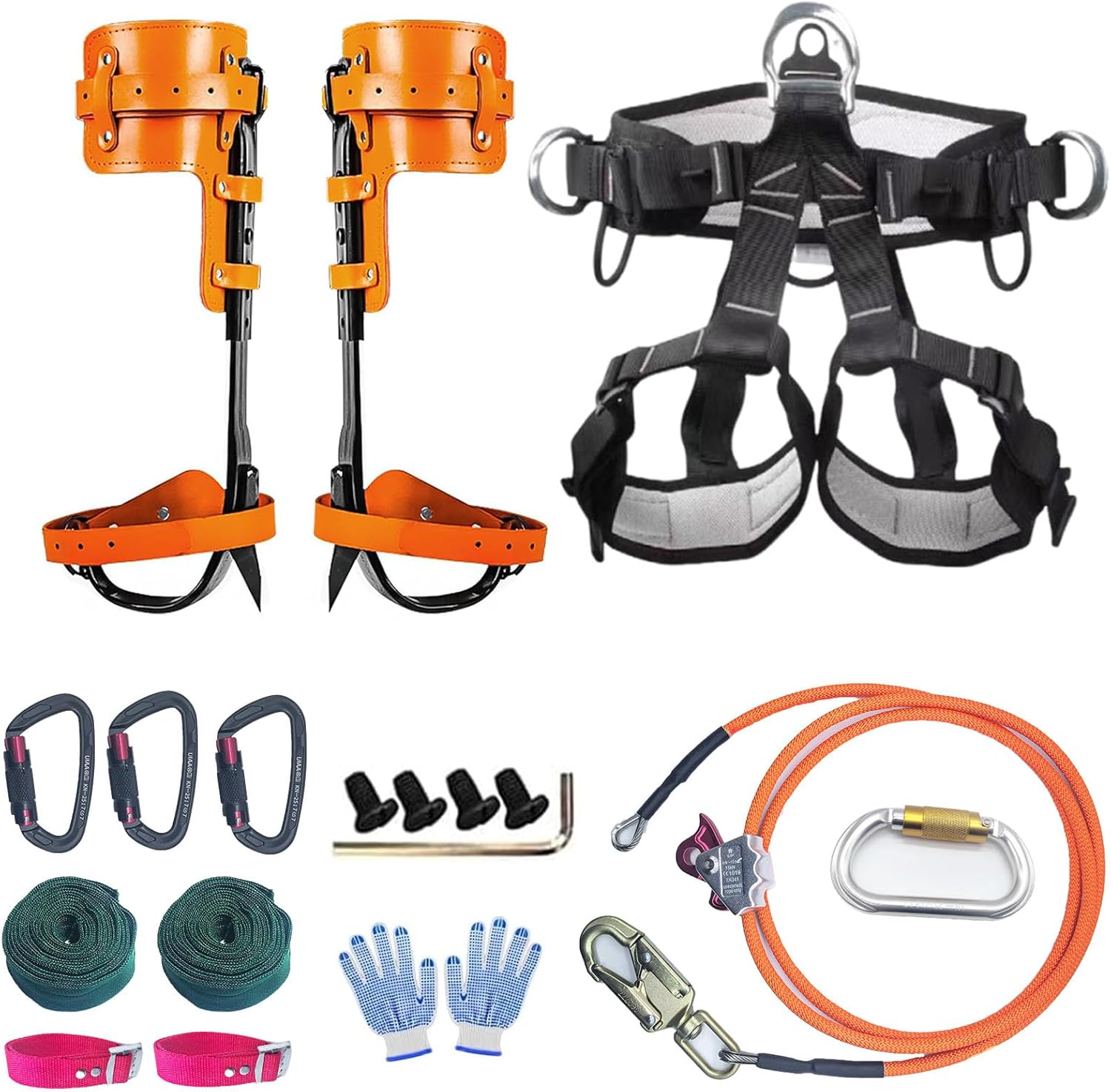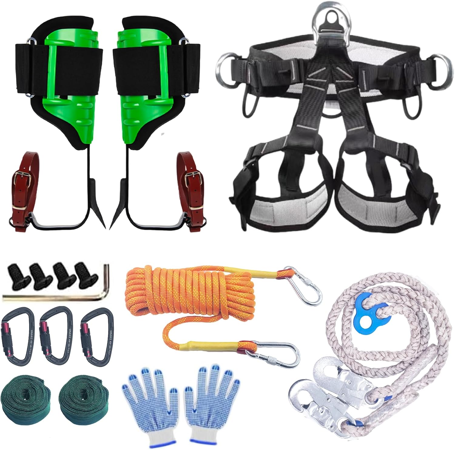 | Included Components | 1 x Tree Climbing Spikes, 1 x Adjustable Belt, 3 x carabiner ,1 x10m nylon umbrella rope,1 protective rope,2 x Foot Straps, 2 x Ankle Straps, 1 x Gloves, 4 replacement screws and a hex wrench |