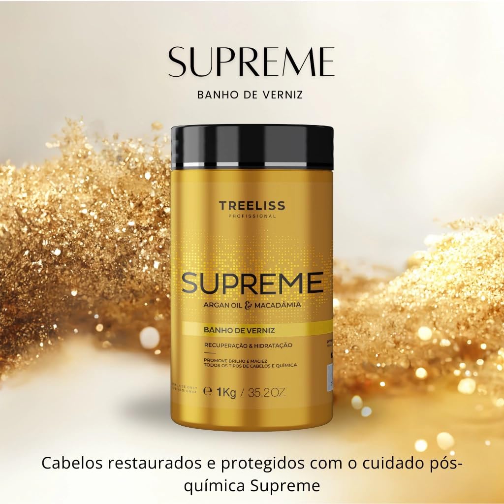 The Supreme Varnish Bath allows the recovery of the capillary structure, providing shine, softness, excellent hydration resulting in high conditioning and emollient action. Reconstruction action, with low molecular weight, it becomes easily penetrable making a gloss coverage with a varnish effect along the entire length of the hair, sealing the cuticle. With anti-frizz action, it restores lost hair mass, minimizing and repairing future and existing damage. Developed for all hair types. It recovers the hair structure, giving shine, softness and excellent hydration. Resulting in high anti-frizz power, it restores lost hair mass, minimizes and repairs damage protecting the hair. THE SUPREME VARNISH BATH ALLOWS: The recovery of the capillary structure, providing shine, softness, excellent hydration resulting in high conditioning and emollient action. With a reconstructive action, with low molecular weight, it is easily penetrated, making a glossy coverage with a varnish effect along the entire length of the hair, sealing the cuticle. With anti-frizz action, it restores lost hair mass, minimizing and repairing future and existing damage. We are Tree Liss, a company that born to develop fully customized products with full control of formulation and production. We listened to the wishes of beauty professionals for a partner that would offer quality alternatives and be concerned with the health of customers. Always with a more natural formulation, providing treatment from the first use. We want you to fall more and more in love with the image you see reflected in the mirror. Say goodbye to dry, damaged hair and hello to a beautiful, healthy-looking mane with the Banho de Verniz Supreme hair mask from Tree Liss.