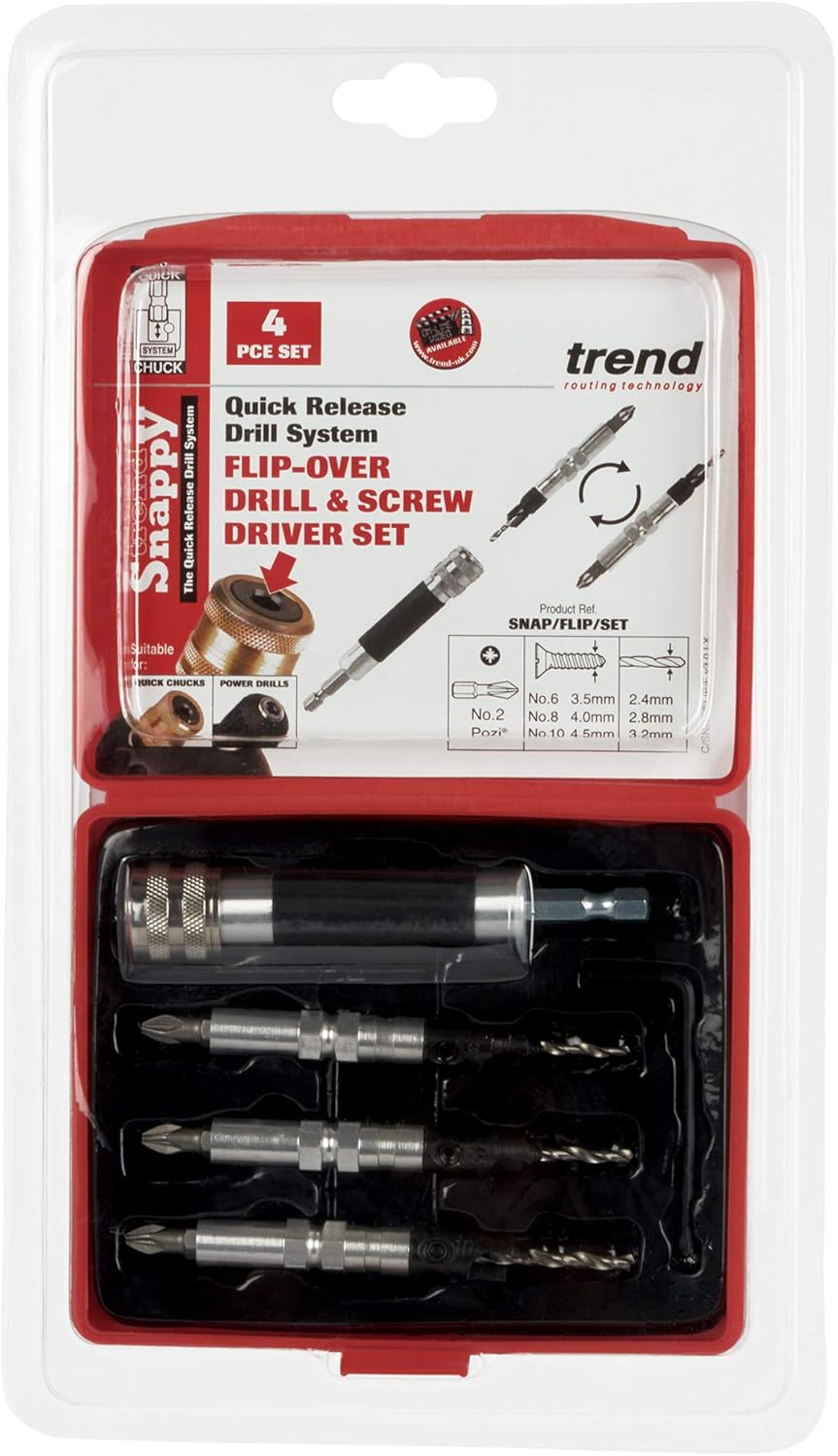 A four piece drill countersinking and screwdriving flip over set. Supplied with quick-change shank for fitting into Trend snappy quick chuck.Drill length can be adjusted with 5/64inch a/F hex key and is supplied with No 2 Pozi¬ drive Insert bits.
