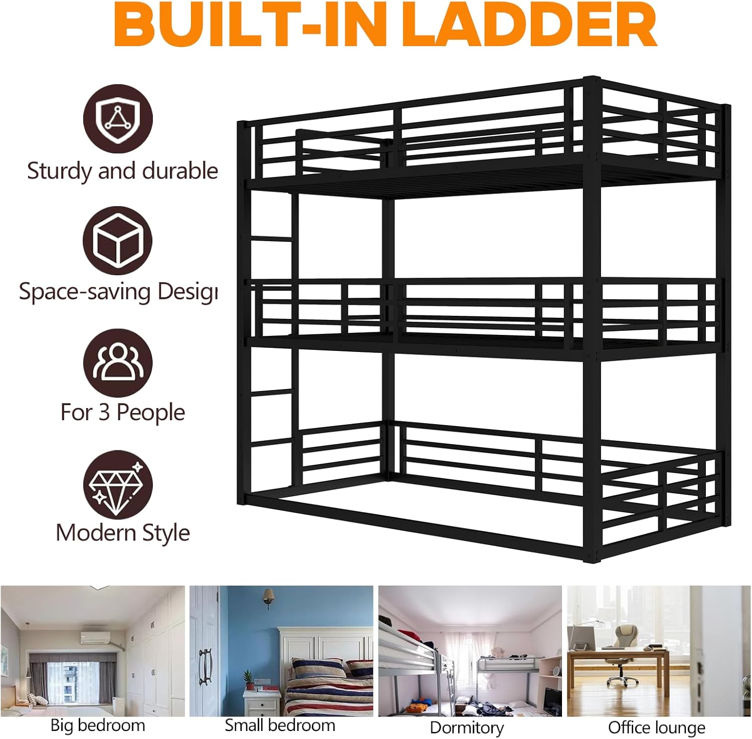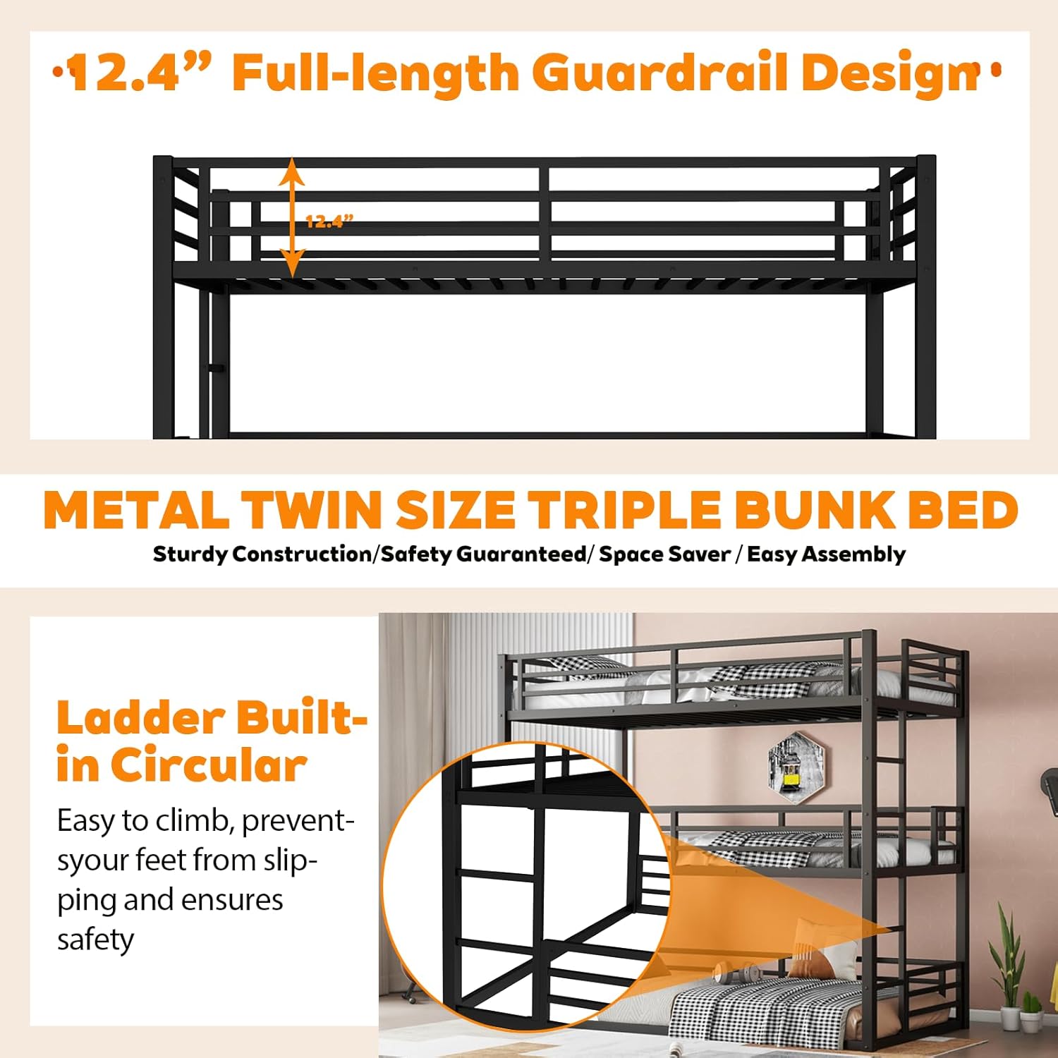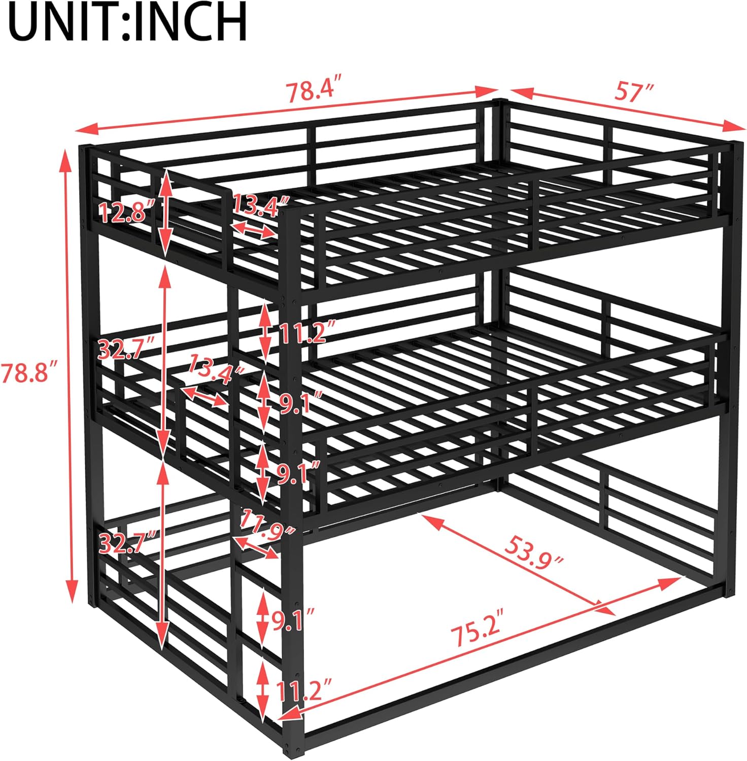 ⭐Contemporary metal and industrial styles meet to create the bunk bed. This strikingly unique triple bunk, providing a smart sleeping solution and space saver for your bedroom. Crafted with metal tubing, this casual update to a classic look will be the focal point of your room. The bed's large side ladder and guardrail offer safety and comfort and include a slatted foundation support system. ①[3 beds in 1] This Twin XL/Full XL/Queen triple bunk bed includes three sizes beds,one twin XL,one full XL and one queen, providing large space for families who has many family members. ②[Space-Saving Design] The triple bunk is the ultimate space saver which is ideal for small bedrooms.Two built-in ladders is convenient for you to climb up and down and won’t take any extra space. ③[Modern Style] The bunk bed’s clean line design will go with various styles of case good finishes and will become the focal point in your bedroom.This fashionable bunk bed will accent your other bedroom furniture, transforming a room from ordinary into something playful setting. ④[Safety Guaranteed] The triple bunk bed is made of high quality metal with superior craftsmanship for optimized strength and long-lasting durability.Besides,this bed with high full length guardrails on middle and top bunk for additional security, which can prevent the accidental falls when your sleeping. ⑤[Easy Assembly] Each order comes with a clear and detailed assembly instruction guide and all necessary tools are provided to get your bed assembled in no time. ✔ Description Bed Material: Metal Size: Twin XL/Full/Queen Color: Black Numbers of Package: 2 Assembly Required: Yes Origin: Vietnam ✔ Dimensions Overall Product Dimension: 83'' L x 61.8'' W x 74'' H Total Height: 74'' Overall Product Weight: 131 LB Twin XL Size Bed Weight Capability: 200 LB Full Size Bed Weight Capability: 250 LB Queen Size Bed Weight Capability: 350 LB Recommend Upper/Middle Bed Mattress Thickness: 6'' Recommend Down Bed Mattress Thickness: 8''
