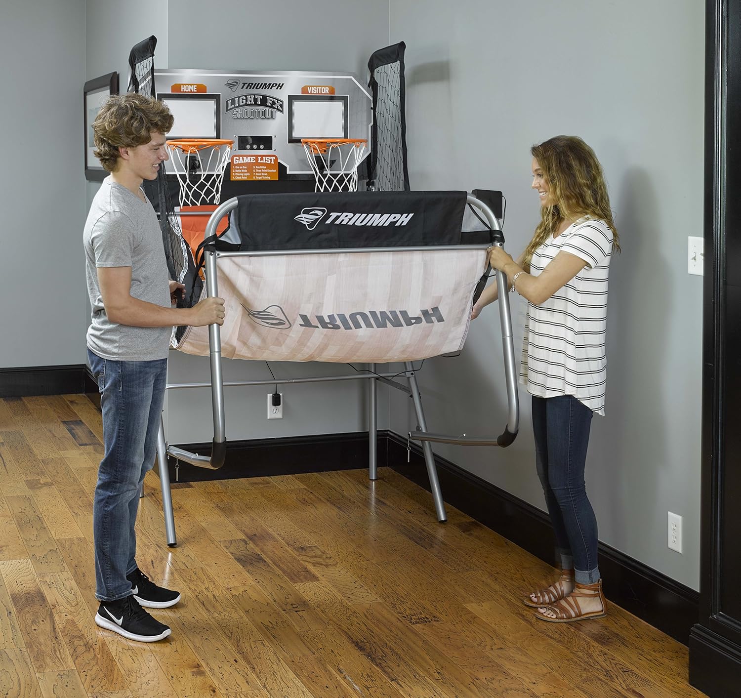 Shoot lights out with the new interactive LED technology of the Triumph light FX double shootout arcade Basketball game. This illuminated shootout features eight light-up game modes or casually shoot hoops on your own with family and friends. The shootout's quick connect frame is easily assembled in five minutes or less with preassembled parts so you can start playing faster. The large 1.5 inch diameter frame poles offer excellent support and stability for years of high-scoring hoops. This shootout includes four basketballs and an inflating pump with needle. When you're finished playing, the light FX shootout conveniently folds up into an ultra-compact storage position.
