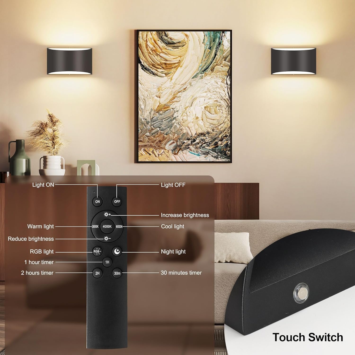 TRLIFE rechargeable battery operated LED wall sconces with remote controlMaterial: Pure Aluminum(Black)Light Source: High quality LED chipsRemote control 10 Dimming brightness levels: 10-100%Light Color: Remote control Adjustable 3 color temperatures(3000K/4000K/6000K), and 12 RGB colorsLighting Direction: Up and Down lighting Style: Industrial and ElegantPackage Included:2*rechargeable battery operated wall sconces2*remote controls2*Type-C charger cords2*packet of mounting hardware1*installation instruction
