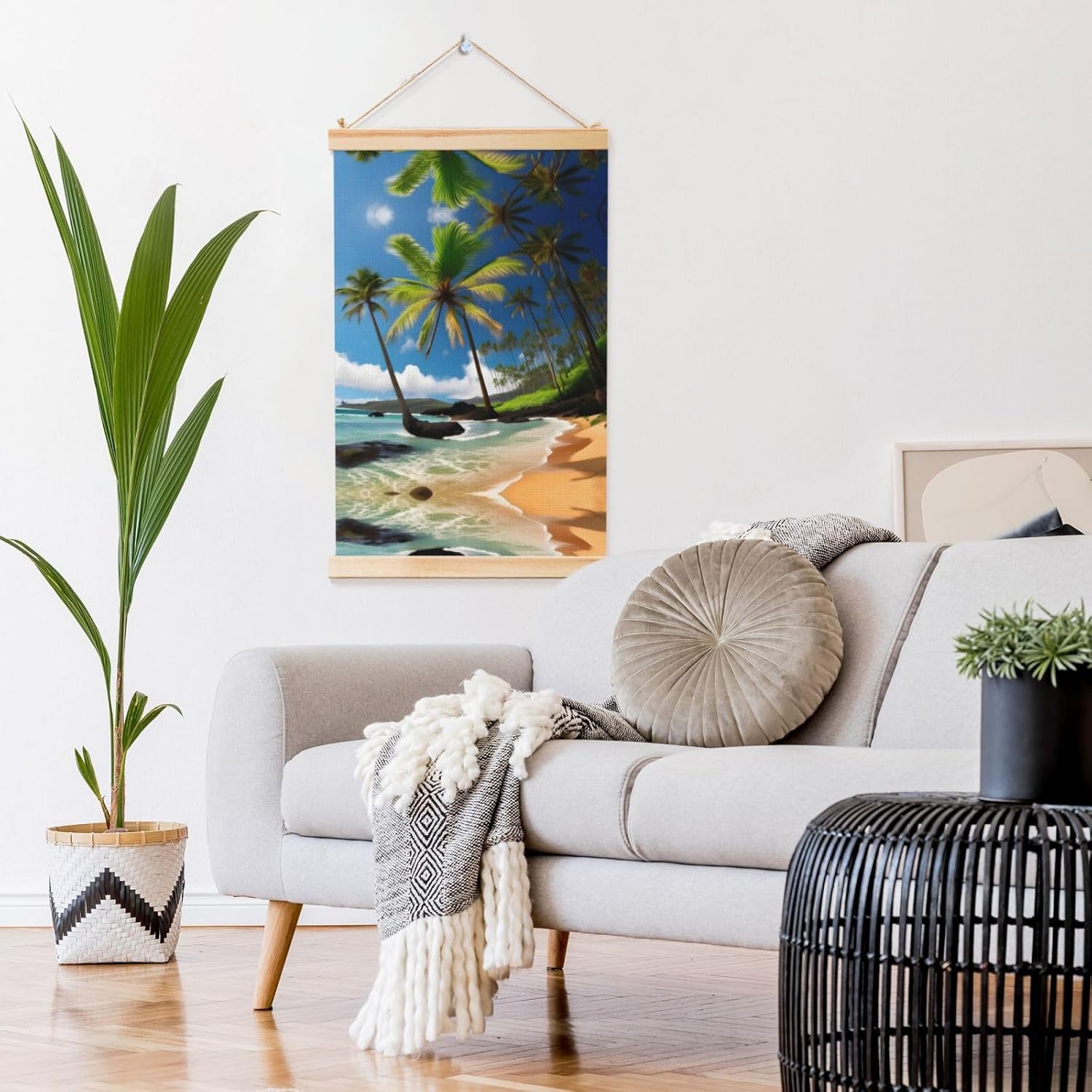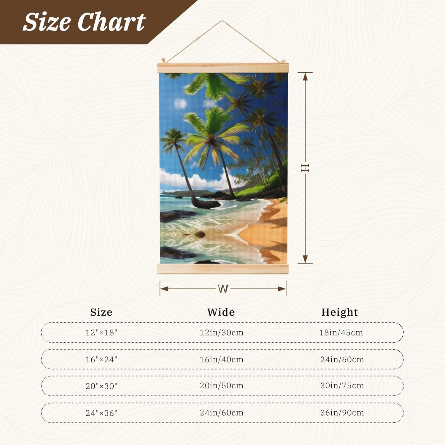 Our Tropical Palm Tree Hawaii Beach Print Wooden Poster Hanger Is An Excellent Addition To Your Home Decor Or A Perfect Gift For Friends And Family. Made Of Selected Quality Canvas With Brilliant And Enduring Colors, This Wall Art Is Designed To Resist Water, Dust, And Fading, Ensuring The Bright And Vibrant Art Lasts. The Polyester Is Enclosed Between Two Teak Wood Hanger Scrolls With An Attached 35cm Rope For Easy Hanging. Installation Is Made Simple With The Included Two Nails In A Plastic Box. The Modern Minimalist Style Of Our Wall Hanging Complements Any Home Decor, Elevating The Artistic Ambiance And Brightening Up The Room. Experience The Elegant Transformation This Wall Hanging Scroll Painting Brings To Your Spaces Today.