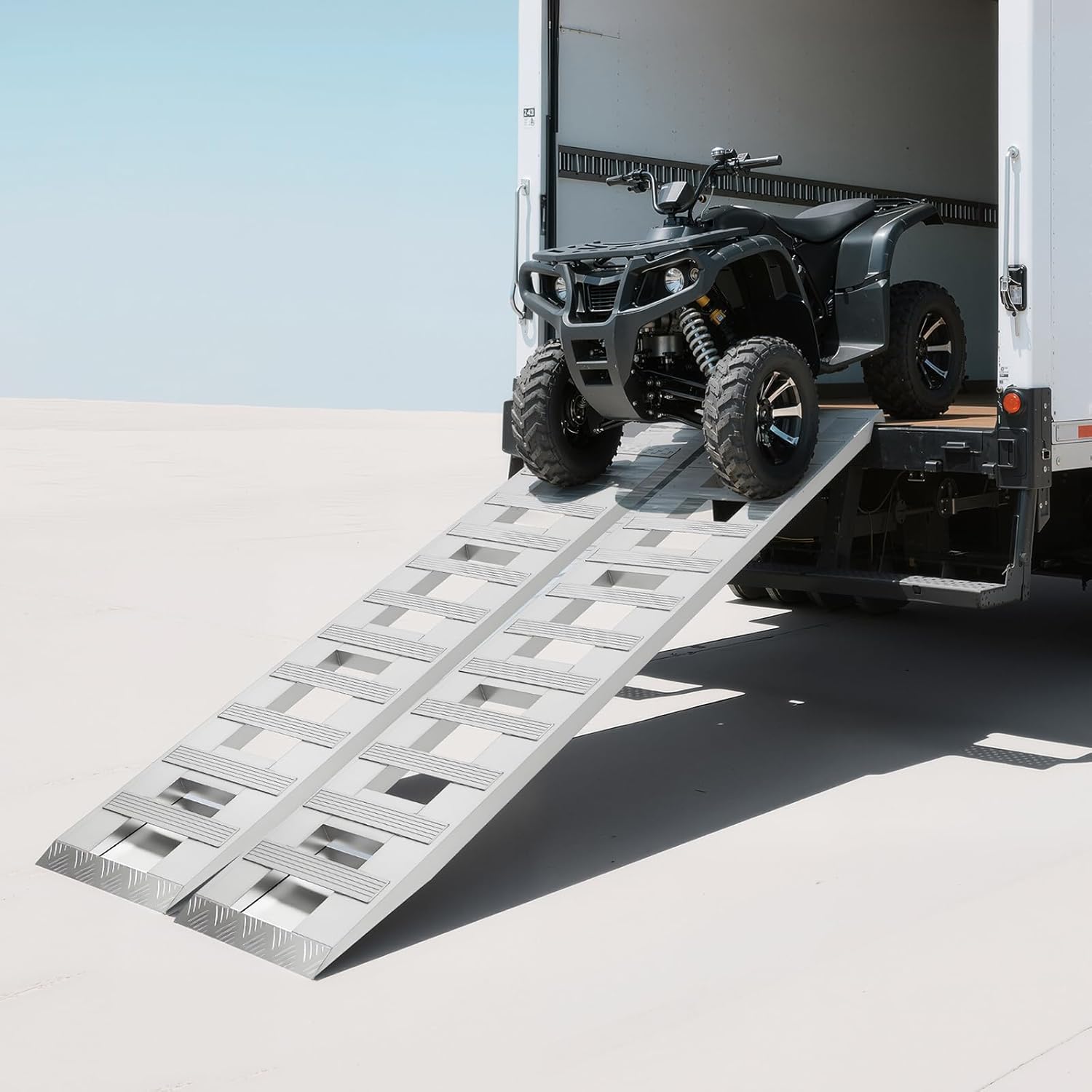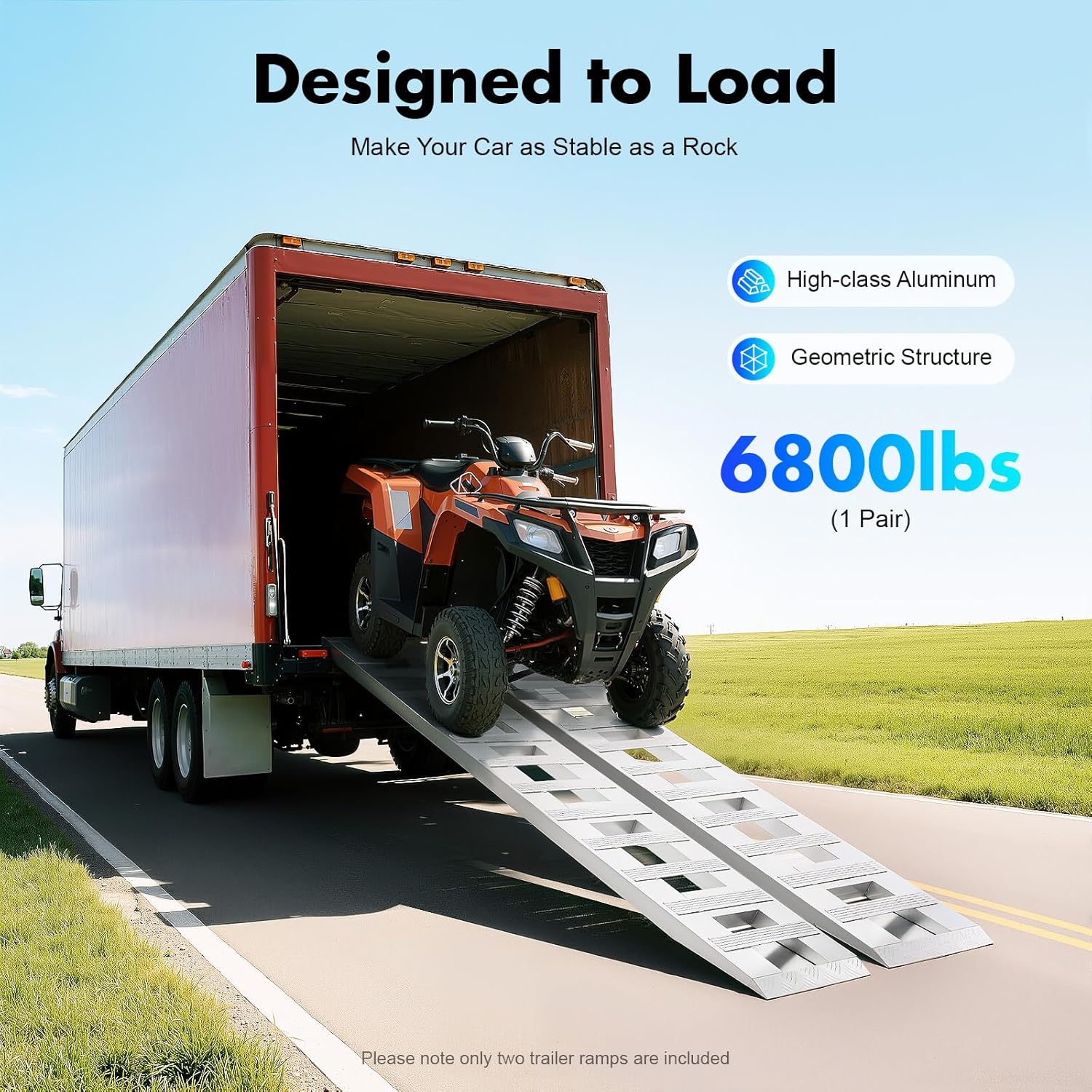 Specification:Material: AluminumProcess: WeldingColor: SilverStyle: ModernShape: RectangularNumber of Pieces: 2Assembly Required: NoPair of Ramps Load Capacity: 3.08t/ 6800lbsThickness: 6.3cm/ 2-1/2inProduct Size(L*W): 182.9*37.8 cm/ 72*15 inGross Weight: 20kg/ 44.09 lbs Package Size: 185*40*15 cm/ 72.83*15.75*5.91 inDetails:Crossbar Design: It increases traction to prevent the vehicle from moving backward during transportation. Smooth Edge: This design not only increases the aesthetics of the product but also improves the safety of use and protects your car from scratches.Effortless Cleaning: Due to the smooth surface, simple structure, and open design, you can easily wipe off.Package Included:2Pcs* Trailer RampsNotes:1.Please make sure the size of the product is suitable for your vehicle before purchasing.2.Please do not exceed the maximum load of the ramp when using it.3.Please allow the slight color difference caused by the shooting light and the 1-3 cm error due to manual measurement, and make sure you do not mind before ordering.