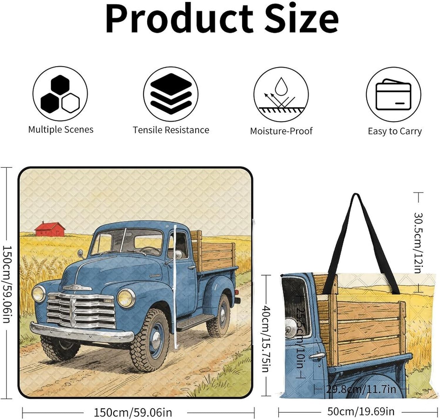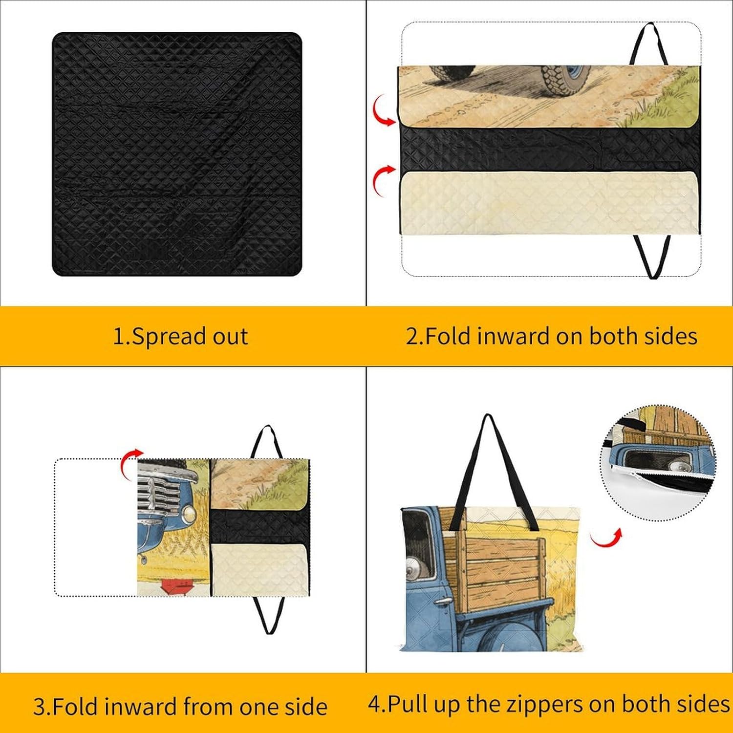 The picnic blanket ,we've only used the highest quality materials, so every picnic is an experience .The underside lining is very sturdy and therefore suitable for every surface. No more worrying about dirty or wet bottoms when you are sitting on damp grass. The Truck blanket protects you from water, dust and dirt.A large capacity bag and a picnic blanket, 2in1. It has a large capacity and one bag can hold everything you need for going out. You choose the place you want to lie down, and this bag can be turned into a comfortable picnic blanket in seconds also it can fold into tote bag, which is waterproof, sand-proof and wear-resistant.Therefor,you can take it to nearby parks, campuses, beaches or lawn, anywhere you want to lie down.
