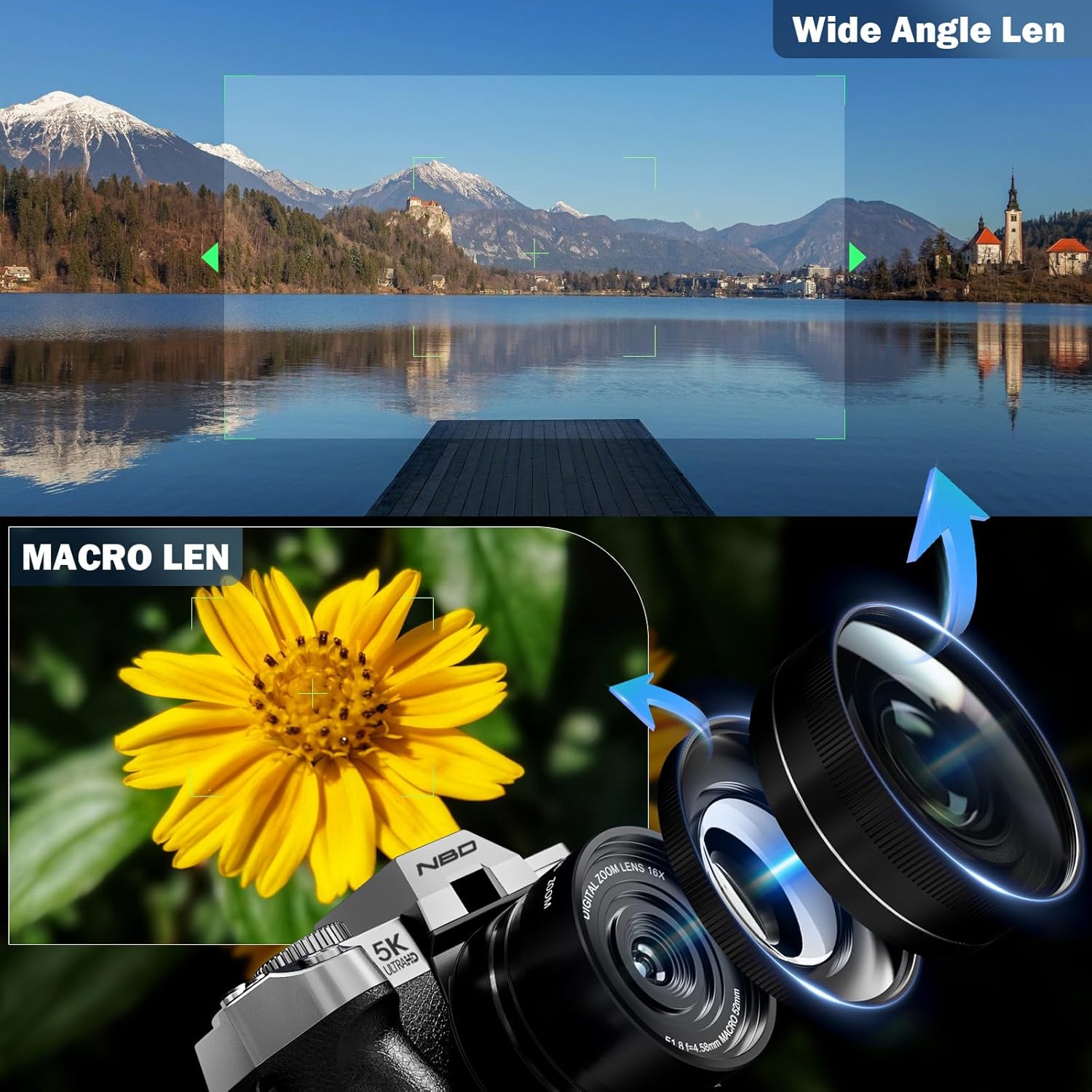 | Camera Lens | The camera features a 52mm wide-angle and macro lens, allowing for versatile photography. The wide-angle lens is ideal for capturing expansive landscapes, while the macro lens enables detailed close-up shots. |