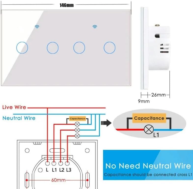1. Upgraded SCR to relay, which has better heat resistance and safety. Also, it works with 100~250V.2. Upgraded capacitor, which is more powerful and stable.1. Support most of lamps. We suggest to use over 5W LED lamp for L1. Not support dimmable lamps.2. The capacitor must be connected with L and N of the lamp of L1. Not behind the switch.3. This switch is single-pole, and it only supports 1 way control.Setting a schedule or timer on/off your lights on night and morning, and then your will never go back to a dark house when you go back home at dusk. Moreover, you could quietly waked up by scheduled light on every morning.haring devices with your family members to eliminate extra steps for connection.Creating your own scene to trigger ON/OFF home appliances by departure mode, home mode, temperature, humidity, or other environmental conditions.The wall switch adopts premium materials, such as fire-resistant shell, phosphor bronze connects and advanced PC+TEMPERED GLASS, can provide fire prevention, overload protection to protect your family.Our all products certificated by CE, FCC, and RoHS. Without using any harmful chemical substances, please fell relived about usage.Color: White/BlackMaterial: PC+ Toughened Glass PanelVoltage: 100-250V 50/60HzCurrent: 10ARated Load: 5-150W/GangPower Consumption: ≤0.5WWorking Temperature: 0℃~40℃RF: 433MHzRF Standard Code: 1527WIFI Standard: IEEE 802.11bgn 2.4GhzSupport System: Above iOS 8.0 or Android 4.3Hub Requirement: NoNetwork Security: WPA/WPA2"Control Mode: APP/RF/ManualCertification: FCC, CE, RoHSAPP: Tuya Smart/Smart Life