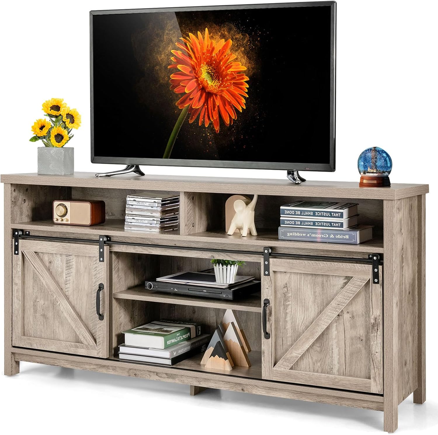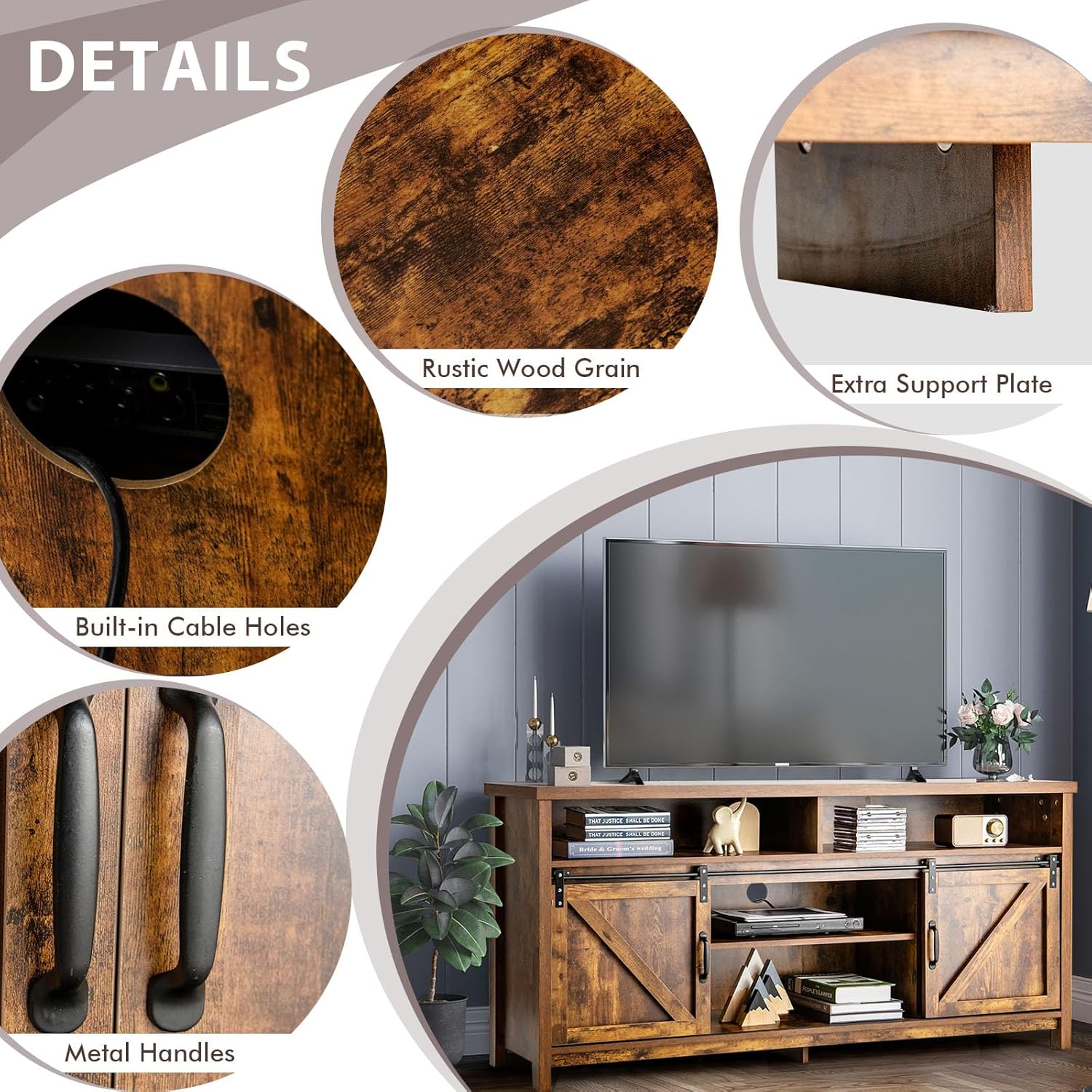 Choose CASART Casart TV Stand Cabinet, make your life easier. Perfect choice for a TV up to 65 inches. Free space arrangement thanks to adjustable shelves. Strong tabletop can withstand a great weight of 100kg. Feature: Durable engineered wood for a long-term use Sliding barn doors designed to hide annoying chaos Works as a storage cabinet or a media console table Additional support plate and foot pads for better stability Diverse media equipment stored neatly in large compartments Specification: Net Weight: 41kg Material: Engineered Wood Weight Capacity of Tabletop: 100kg Weight Capacity of Each Shelf: 10kg Color: Rustic Brown/ Dark Brown/ Maple Grey Overall Dimensions: 150 x 40 x 74cm (L x W x H) Package Includes: 1 x TV Stand Cabinet, 1 x Instruction Attention: We are so sorry that our couriers service cannot ship to the following areas: Channel Islands (such as Jersey and Guernsey), Lerwick, Outer Hebrides, Isle of Man, Scilly Isles, Scottish Island, PO Box. If you want to return our items, plz make sure that it's in original packaging and authorized by us. Plz do not ship any products to any places without our authorization since it may lead to unsuccessful return.
