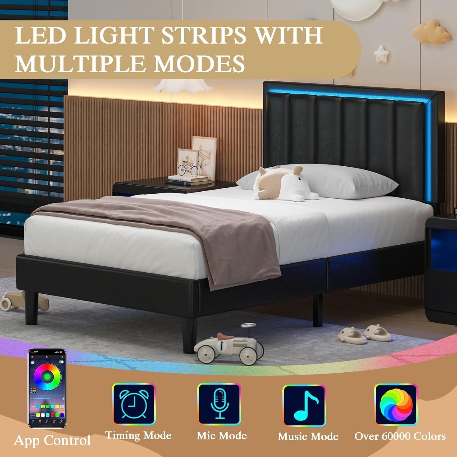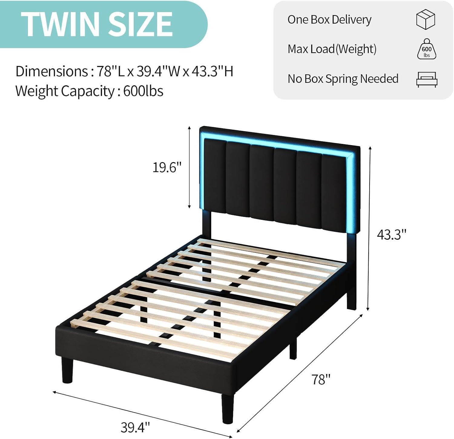 | Included Components | PU Leather Headboard, Metal Bed Frame, LED Light Strip, Metal Slats, Support Legs, Assembly Tool, Instruction Manual |