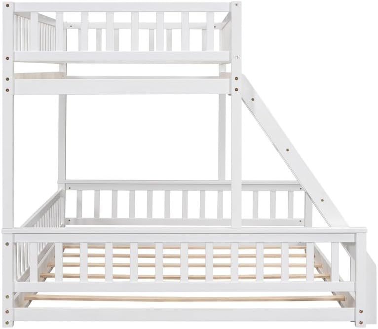 Key Features:◆ Durable Pine Wood & MDF FrameCrafted from solid pine wood and premium MDF for lasting durability and a sturdy sleeping structure.◆ Built-In Safety FeaturesIncludes full-length guardrails on the upper bunk and a secure angled ladder for safe and easy access.◆ Modern Minimalist AppealThe simple, sleek lines and white finish provide a versatile look that complements a variety of bedroom styles.◆ No Box Spring RequiredBuilt-in slats provide reliable mattress support for both bunks, eliminating the need for additional foundations.◆ Specifications:Product Type: Bunk BedSize: Twin XL Over QueenColor: WhiteMaterial: Pine Wood + MDFAssembly Required: YesBox Spring Needed: No● Recommended Mattress Thickness:Upper Bunk: 8–10"Lower Bunk: 8–10"● Weight Capacity:Upper Bunk: 300 lbsLower Bunk: 400 lbs● Overall Dimensions: 84.7"L x 63.7"W x 58.3"HTwin XL Bed Dimensions: 80.9"L x 39.3"WQueen Bed Dimensions: 80.9"L x 61.2"WCountry of Origin: Vietnam◆ Package Information:Package 1: 67.9" x 13" x 8.5" | 67.24 lbsPackage 2: 85" x 12.5" x 6.5" | 64.37 lbsTotal Product Weight: Approx. 132 lbs