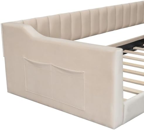 Twin XL Size Upholstery Daybed with Side Storage Pocket, Velvet Sofabed for Living Rooms, BeigeThis daybed gives you another spot in your home for you or your guests to stretch out, relax, and have a snooze. It features a clean-lined classic silhouette that includes sloped arms for a traditional look. Plus, it has a solid and engineered wood frame that rests on tapered dowel legs for a modern touch. Wrapped in velevet fabric, this bed comes with a slat system that supports a twin-sized mattress.We love that this daybed features vertical channel tufting for a chic, modern aesthetic. Weight & Dimensions: Overall Product Dimension: 87.8''L x 40.9''W x 22.8''H Overall Product Weight: 81 LBS Bed Dimension: 79.9''x 39.4'' Detail Product Dimension: Please refer to the size image Number of Package: 2 Package 1 Dimension: 89 * 12.25 * 5.6 in. 48.5 lbs. Package 2 Dimension: 44 * 22.75 * 9.25 in. 40.79 lbs.Weight Capacity: 400 LBS Recommended Mattress Thickness: 6'' Specifications: Product Type: Upholstered Day Bed Size: Twin XLColor: Beige/Grey Fabric Material: VelvetProduct Material: Pine Wood+MDF+Velvet Box Spring Required: No Mattress Included: No Assembly Required: Yes Country of Origin: Vietnam Notes: -Manual measurement has been used,there may be some reasonable error. -All the pictures are taken by actual samples, slight chromatic aberration may occur due to lighting or display.