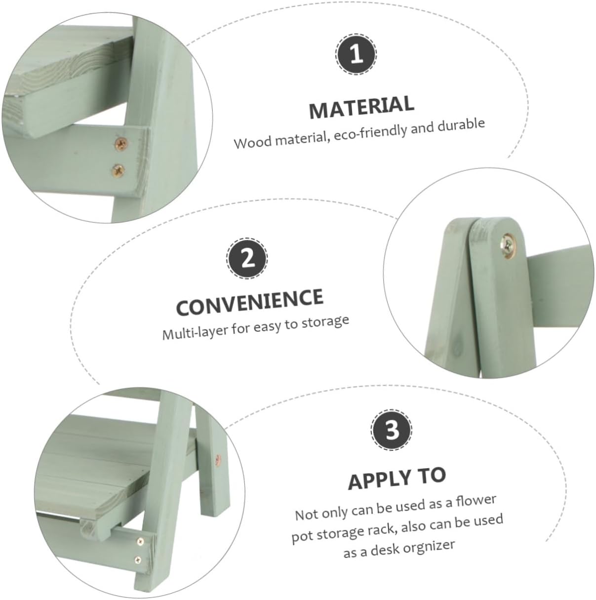 Package Include 1 x wooden storge rack Features -Color: Green Multi-layer Plant Stand. -Size: About 35 x 30 x 20 cm/13.78x11.81x7.87 inch. -Material: Wood. - Suitable for indoor and outdoor wear Wooden Flower Pot Rack. - Not only can be used as a flower pot storage rack, also can be used as a desk Succulent Storage Rack. - Wood material, and Wooden Shelf for Flower Pot. - Multi-layer for easy to storage Plant Stand Shelf. - A great present choice to friends in housewarming.Goods InformationWooden Flower Pot Rack Due to the , each item will have its own unique characteristics and scars.Wooden Shelf for Flower Pot Made of premium wood material for use.Plant Stand Shelf Proper size for easy to place it on the desk and balcony.Succulent Storage Rack This item is a simple shape flower pot storage rack stand.Multi-layer Plant Stand Also can be used as a desk storage shelf