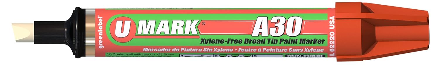 A30's larger, more visible marks are about three times the size of marks made with standard paint markers. Perfect for construction sites, auto parts, lumber yards and other applications where items need to be identified from a distance. While other broad tip paint markers have a barrel that is too wide for comfortable marking, A30’s 3/4" aluminum barrel is easy to grip. greenlabel paint resists outdoor and rough use conditions and dries fast. The replaceable tip has good resistance to abrasion. Broad tip 3 mark widths 5/16", 3/16" and 1/8". Paint Content 17 cc.