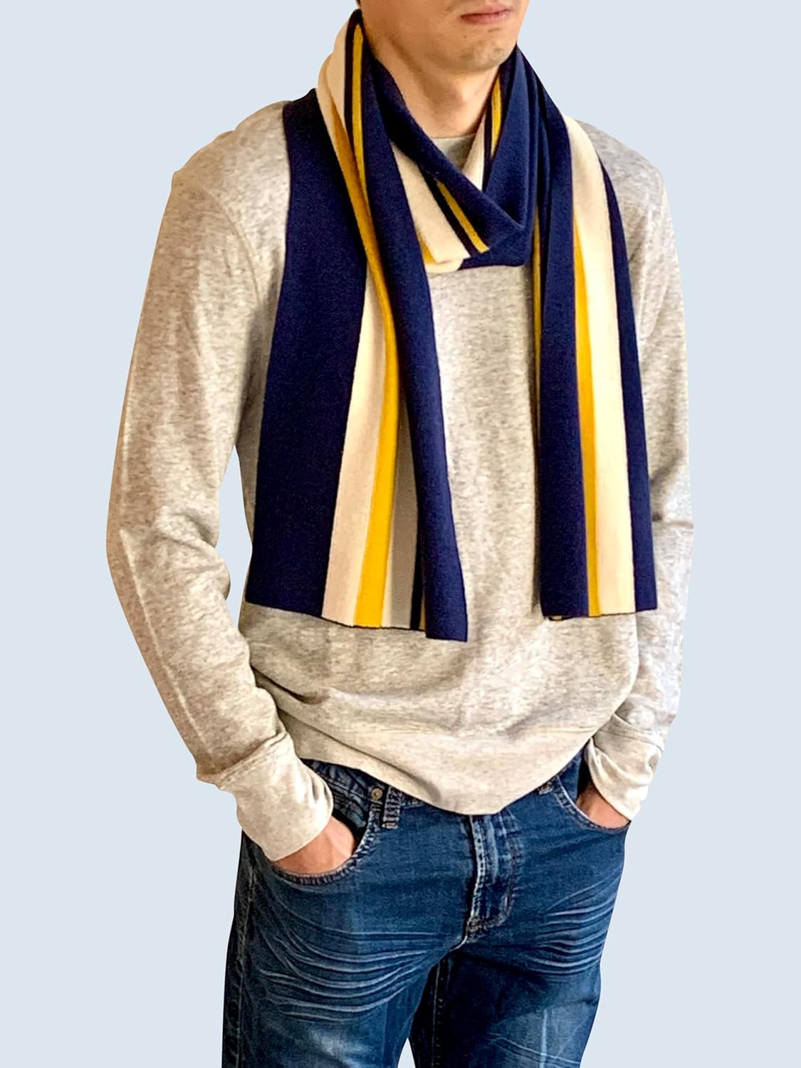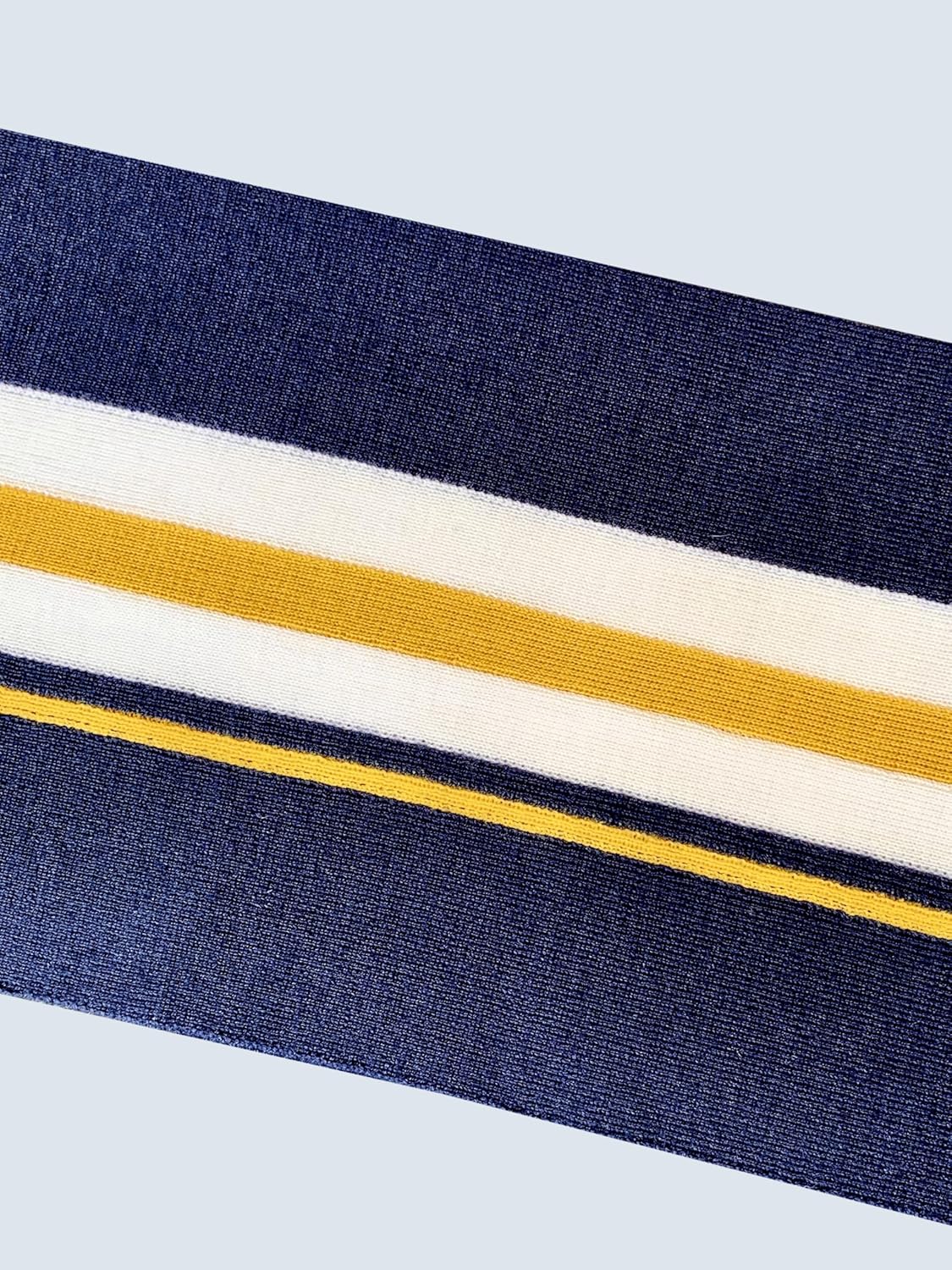 Embrace timeless sophistication with this classic striped scarf. Crafted from high-quality materials, it features a striking navy, maize, and cream color palette that effortlessly complements any outfit. With its generous size, this versatile accessory can be elegantly draped or wrapped to provide warmth and style. Whether you're dressing up for a more formal event or adding a touch of refinement to your casual ensemble, this collegiate-inspired scarf is fashion foward.