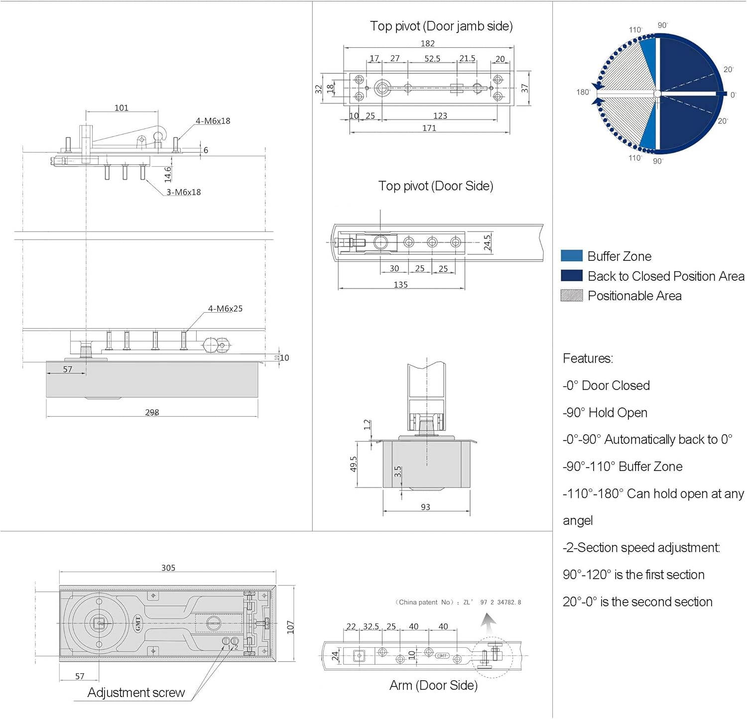 Features: Floor hinge is a device which installed with the bottom of the door leaf and let the door close automatically.It's widely used with wooden door, steel door, aluminum door, glass door, fireproof door. One-piece cover plate design,not easy to leak and anti-corrosion Thick stainless steel casting, sturdy and durable, strong anti-strike ability Center hung, double action with 90 degree Stop-Device, 2 section speed adjustment valveSpecifications: Dimension: 298x93x49mm / 11.73x3.66x1.93in Max Door Weight: 120KG / 265lbs Door Width: 1600-2000mm / 63-78.74in Max Open Degree: 360°Package Included: 1 x Floor hinge 1 x Top Pivot Seat 1 x Pivot Bottom Seat 1 x Center Pivoted Arm 1 x Sheet & Wrench