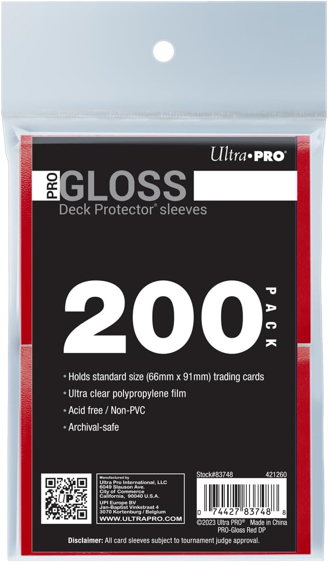 Introducing the Ultra PRO PRO-Gloss Standard Card Sleeve Deck Protector, a must-have for collectors and players alike. This 500ct bundle of high-quality sleeves is designed to protect and showcase your standard-size cards, be it for sports, Magic: The Gathering, or Dungeons & Dragons. Crafted from acid-free, non-PVC polypropylene, these sleeves ensure the longevity of your precious cards by safeguarding them against scratches and wear. The high-clarity gloss finish delivers a stunning visual presentation, highlighting every intricate detail of your collection. The textured matte back of these sleeves not only prevents cards from sticking together but also guarantees a smooth and seamless shuffle during gameplay. Each bundle of 500 sleeves is versatile, fitting both Pokémon and Magic: The Gathering trading cards. Recognize the mark of Ultra PRO quality with the heat-transferred holographic stamp, assuring you of top-notch craftsmanship. Available in a range of six colors—Black, Blue, Clear, Green, Red, and White—you can choose the perfect shade to complement your unique collection.
