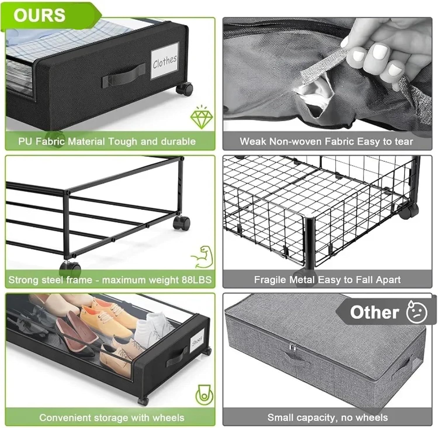 Efficient Space Utilization: The underbed storage bins maximize your bedroom space by neatly storing clothes, shoes, and other items, keeping your living area organizedConvenient Accessibility: Designed with easy-to-use lids, these under bed storage containers allow for quick access to your belongings while ensuring they remain dust-freeFoldable Design: The foldable underbed storage bags can be conveniently stored away when not in use, making them a practical choice for seasonal storage needsSturdy Construction: Made from sturdy and durable materials, these underbed storage containers bin with lids are built to withstand regular use and protect your itemsVersatile Storage Solution: Ideal for bedrooms, dorms, or apartments, the bed storage organizer box is suitable for anyone looking to optimize their storage space while maintaining a tidy environment