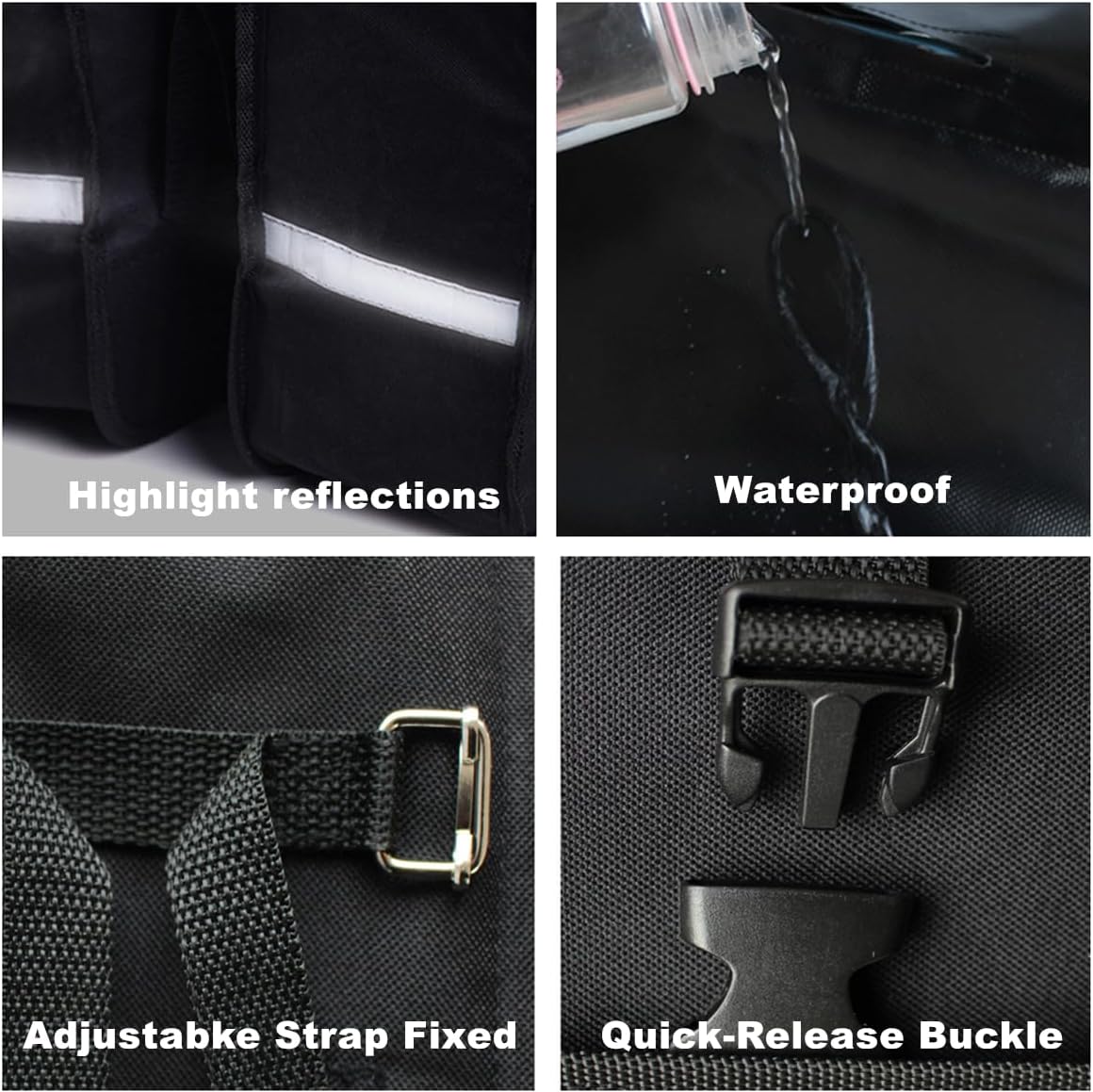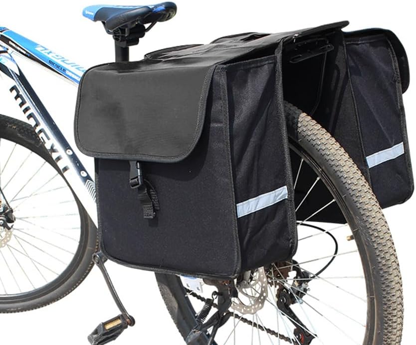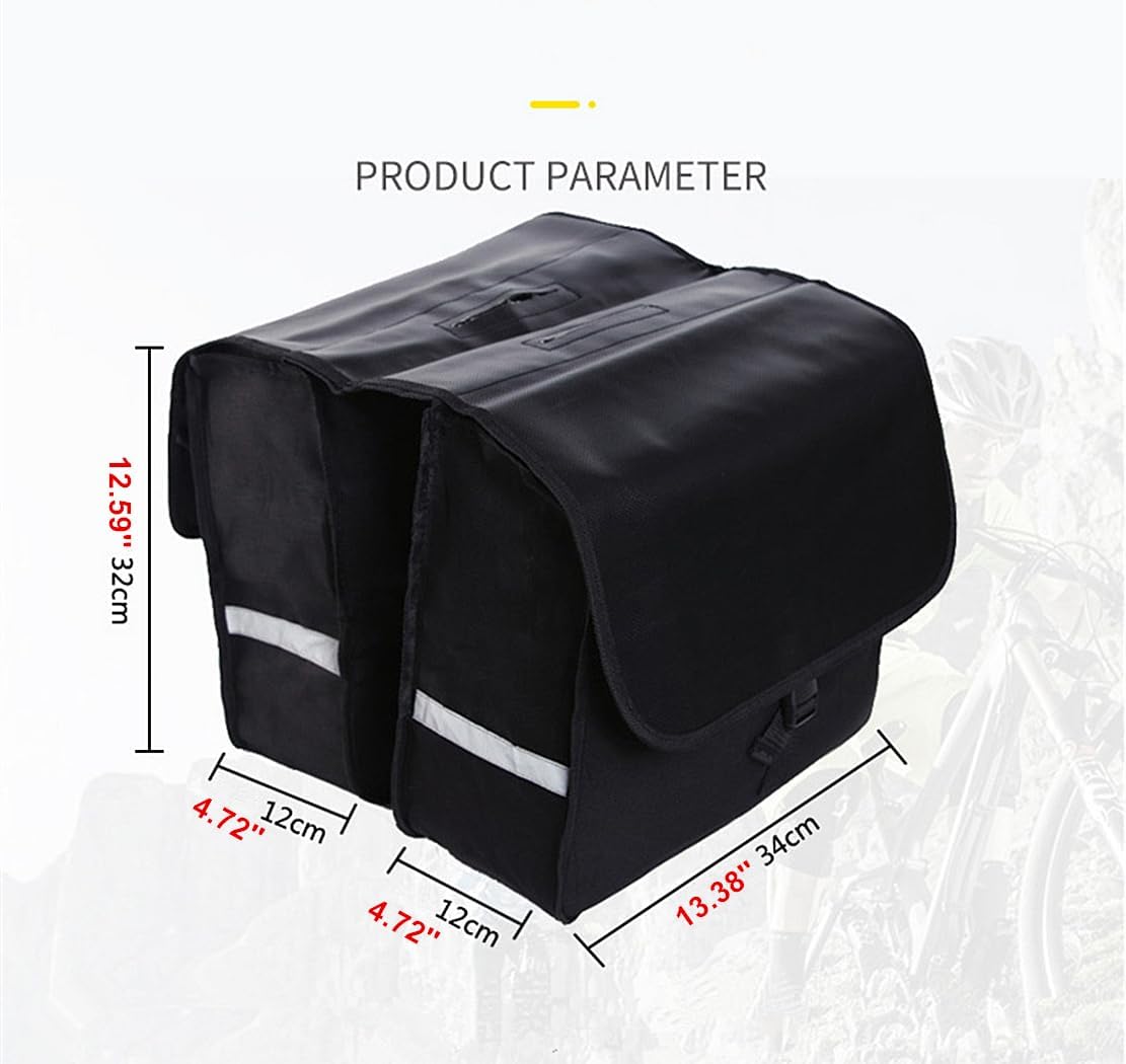 UNISTRENGH Bike Panniers Bicycle Rear Saddle Carrying Bag Outdoor Cycling Luggage Bag Motorcycle Rear Hanging BagLarge capacity and easy to installThe UNISTRENGH double side bike rack tail bag is big enough to pack everything you need. It is perfect for bike touring, camping, hiking, fishing, road trips, picnics in the park, boating, pool parties, beach excursions, field trips, BBQ gatherings, and other indoor and outdoor activities. It can also be used as a grocery bag, or a bike bag for the everyday commuter. The middle connection can fit a variety of bicycle backseats. This double side bike rack tail bag is big enough to pack everything you need.Specification:Product name: Bicycle panniers saddle bagColor: Black with Orange edgeSize: 12 x 4 x 11 inches/30*10*28cmMaterial: 600D Oxford fabricWeight: 0.61 kgPacking: pp bagColor: Black with Orange edge, Black ( Flap cover with Pu coating), Black ( Flap cover with Pu coating) /with Rainproof coverSize: 13.38 x 4.72 x 12.59 inches / 34*12*32 CMMaterial: high density 600D polyester fabric, with PVC coating, waterproofWeight: 1.76 lbs /800 gPacking: pp bagFeature:Panniers with 2 large compartments, reflective trim, and carrier handle on top.And 2 hook&loop pockets on each bag, cover flap designed with big buckle.The 2 compact panniers bag are connected by 2 buckles, it also can be used separately.Reflective trim - 3M Scotch Lite reflective trim ensures night time visibility.The reflective rim around the bag ensures nighttime visibility which makes your ride more secure at night or in low light environments.Four shelf straps for mounting, fit most bicycle rack Package Including: 1 x Bike saddle bag
