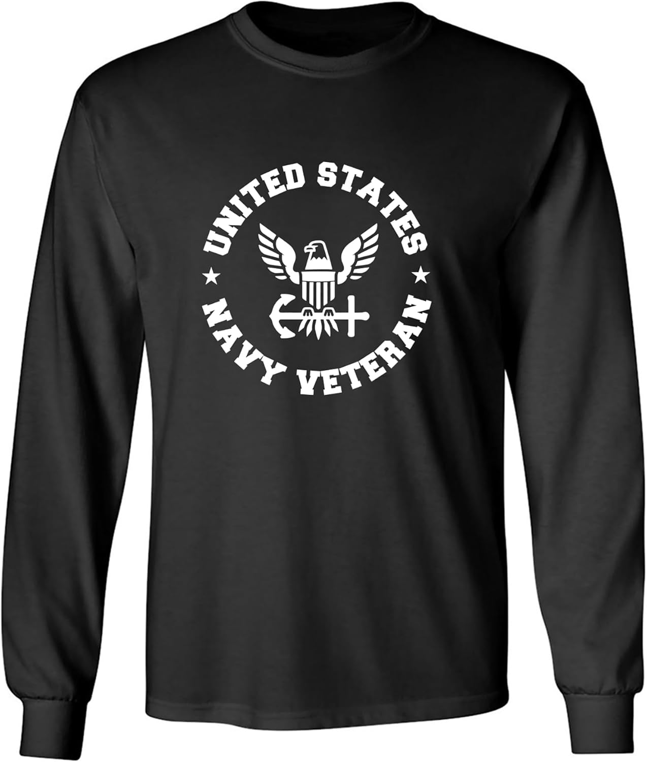 This military theme shirt features "United States Navy Veteran" in a circle design on the front in white on an Adult Long Sleeve T-shirt. Featuring a taped neck and shoulders for comfort and double-stitched sleeve and bottom hems for extra strength, our shirts are designed for both comfort and quality. This garment is officially licensed by the United States Navy.